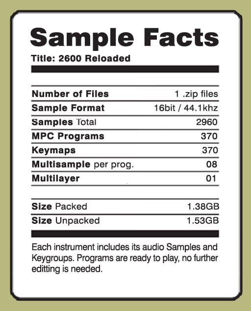 Based on the Arp 2600. A neat selection of what this synth is capable to do. Despite its almost infinite range of raw analog madness, a huge portion of its sonic realm was poured into this valuable library. Including a set of samples available for the MPC family. Each instrument includes audio Samples and Keygroups. You can load these sounds straight into your MPC and you'll be ready to play the instruments, no further programming needed. This is a downloadable product. All instruments are multi-sample and multi-layer at 16-bit/44.1 stereo quality. Every sample was smoothly looped to save sample memory and loading time. More than 1.4GB of audio data including the best Basses, Leads, Synths, Pads, Percussion, Sound Effects and much more directly sampled from the Arp 2600 classic analog synth.