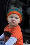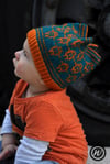 Stranded knitting is used to full effect with this charming little Hat. Robot-like characters adorn the main body, and the distinctive crown is created through a combination of cleverly placed stripes and the crochet bind-off method.