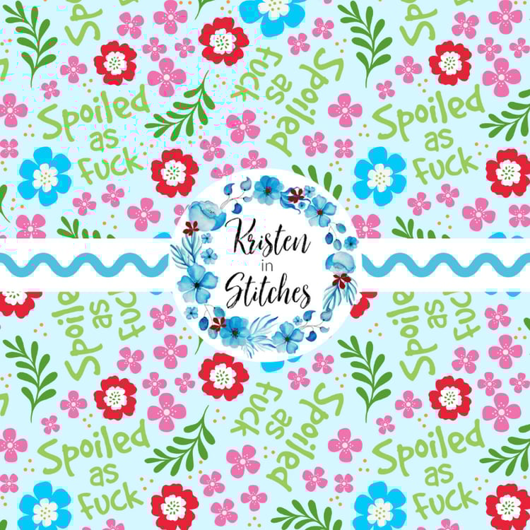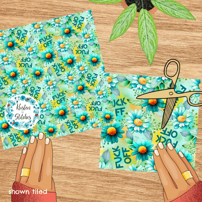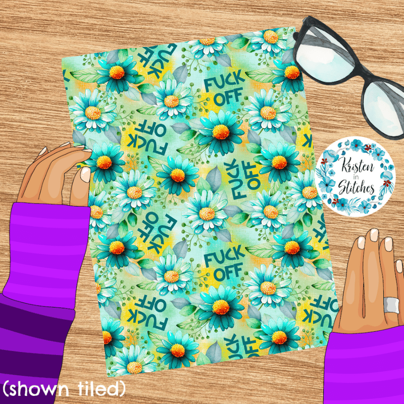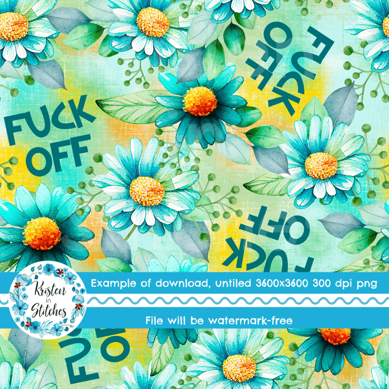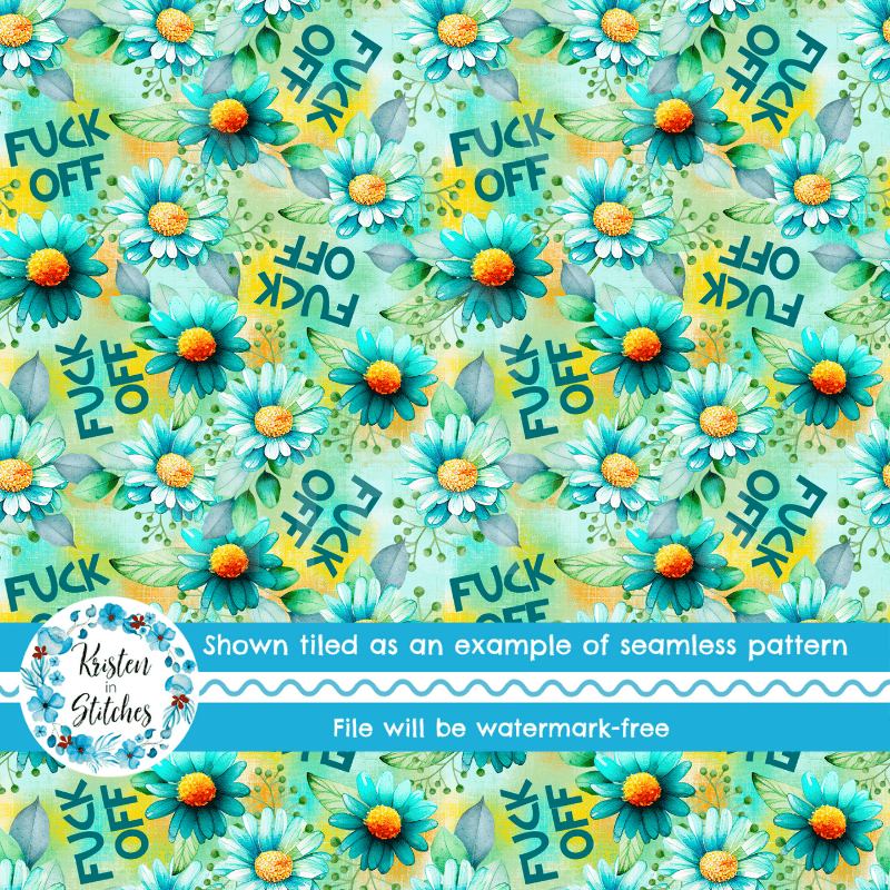 Fuck Off Swear Word Seamless Pattern, Pretty Profanities, Turquoise Daisy Flowers
