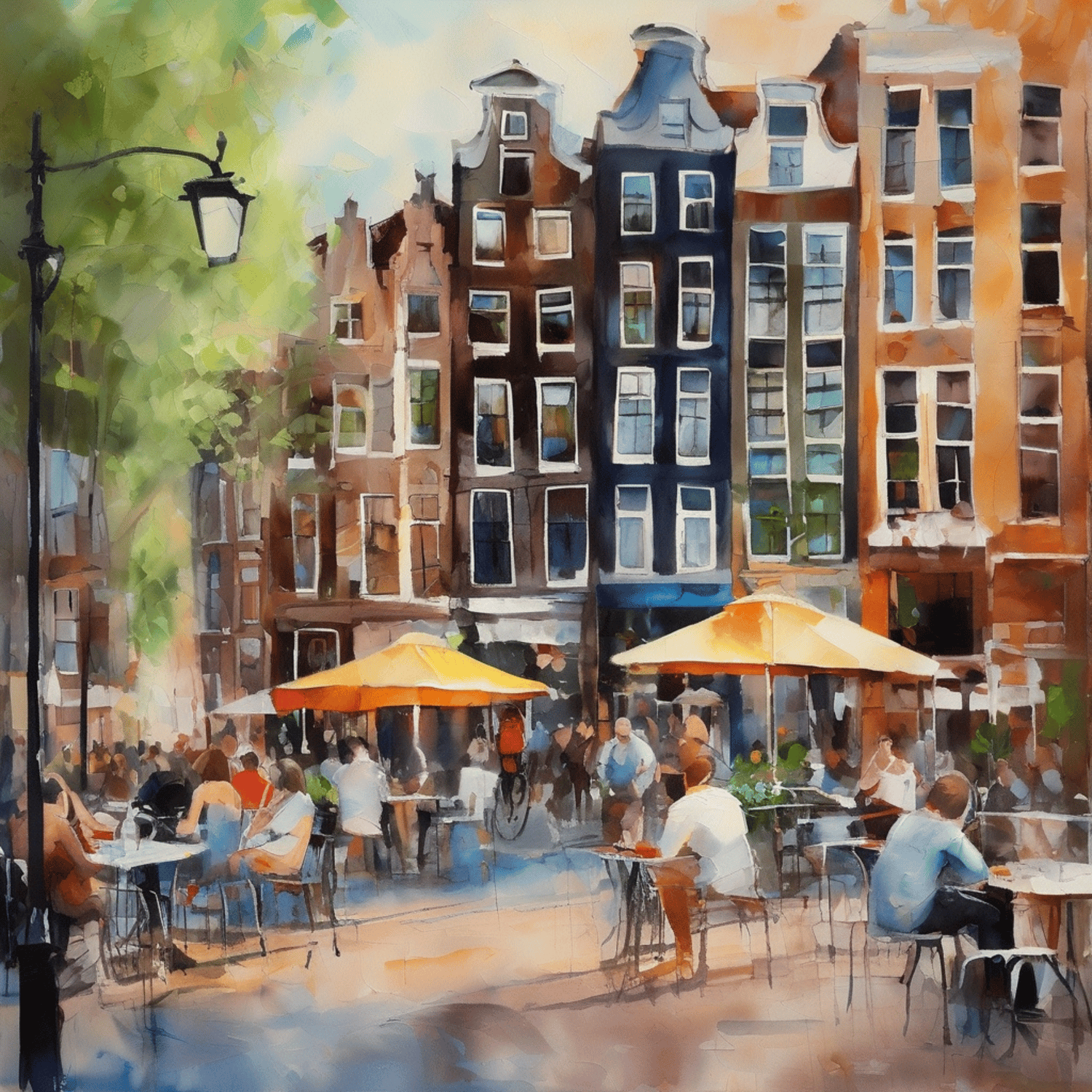 Amsterdam city.summer. Cafes.Passersby, sidewalks. Oil colors.