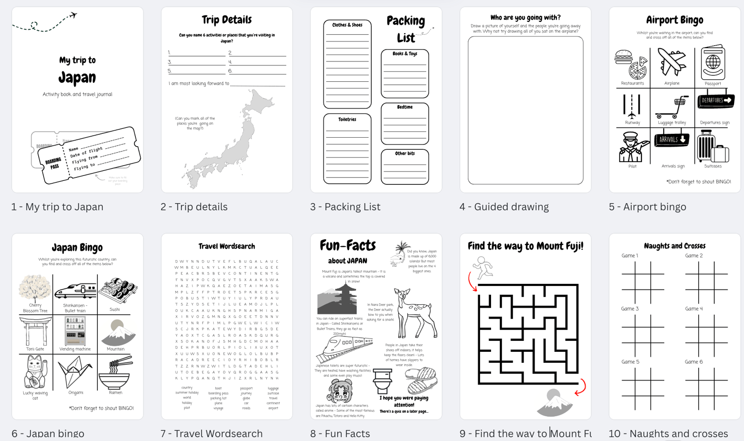 "My Trip to Japan" isn’t just about keeping kids busy – it’s a practical guide too! Packed with kid-friendly travel tips, space to fill out their own itinerary, a packing checklist, flight-friendly games, and even airport bingo, it helps children feel involved and prepared for the journey ahead.