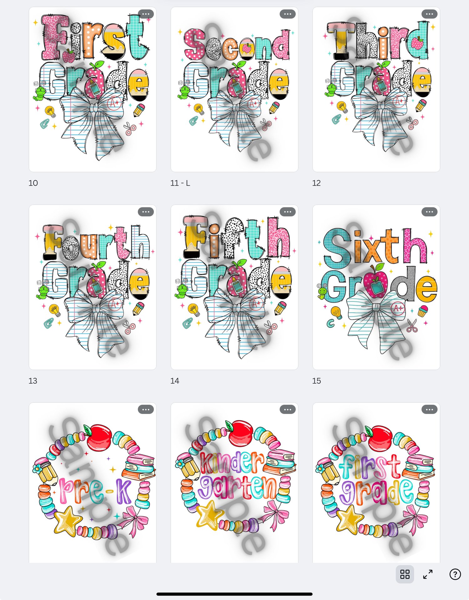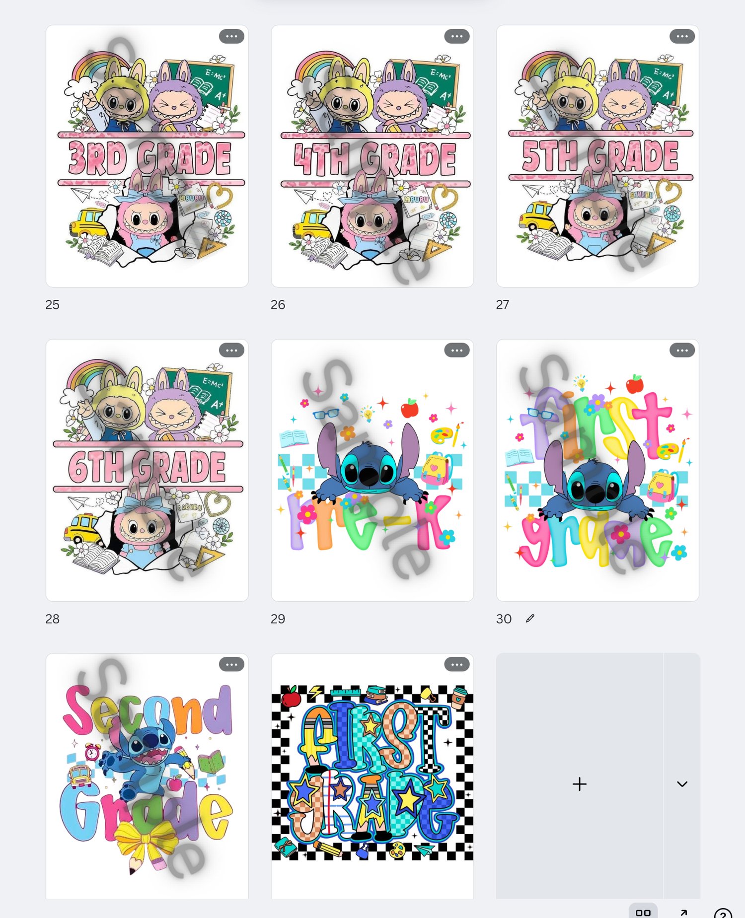 32 images for back to school products. Ready to download, print, and/or edit in canva.Two sets Pre-k through sixth grade, one set pre-k through fifth grade, Labubu set is first through sixth grade, and three stitch bonus images.