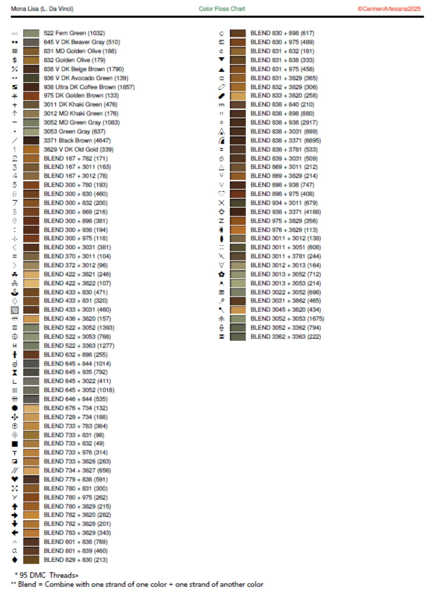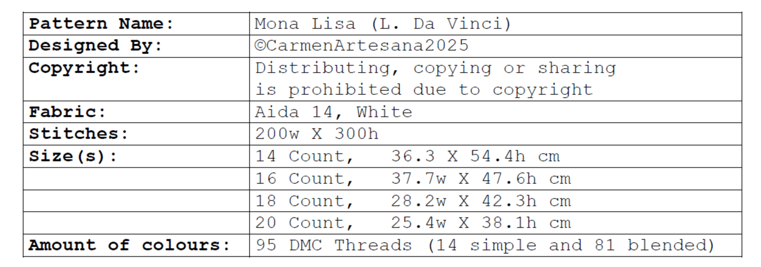 PDF cross stitch pattern, MONA LISA/GIOCONDA (L. Da Vinci). English / Español, DMC Threads