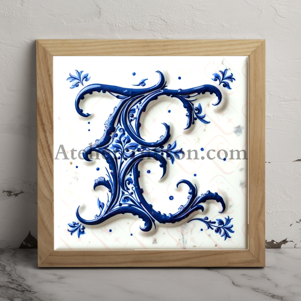The letter E delftware blue tiles Download Now this high quality AI-generated image, perfect for adding a touch of tranquility and creativity to any space.