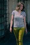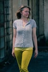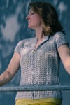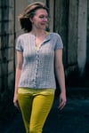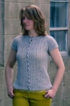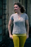 Construction: Arcady is cast on at the neckline and worked in lace pattern with raglan construction to the armhole depth. The sleeves are divided and placed on hold, while the body is worked in the continuous lace pattern, with no shaping to the narrow hem. Stitches are picked up along the front edges and neckline, and a tidy applied I-cord with integrated buttonholes is worked to finish the edges. Finally, the cap sleeves are finished with a narrow rib and elegant slender garter edge, matching the hem.