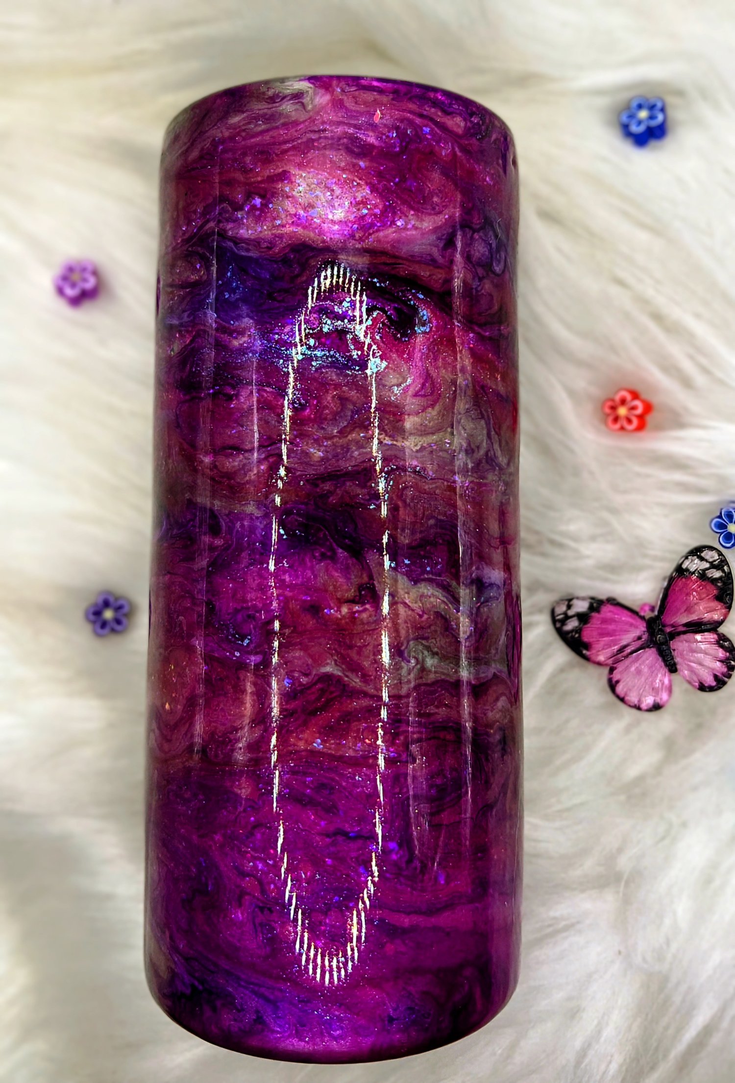 This 20 oz slim tumbler is a deep dive into decadent purples, lush magentas, and galaxy shimmer — like velvet skies lit up by stardust. Hand-swirled with alcohol inks and mica powders, no two are ever the same. This cup is bold, magical, and unapologetically ✨extra✨.