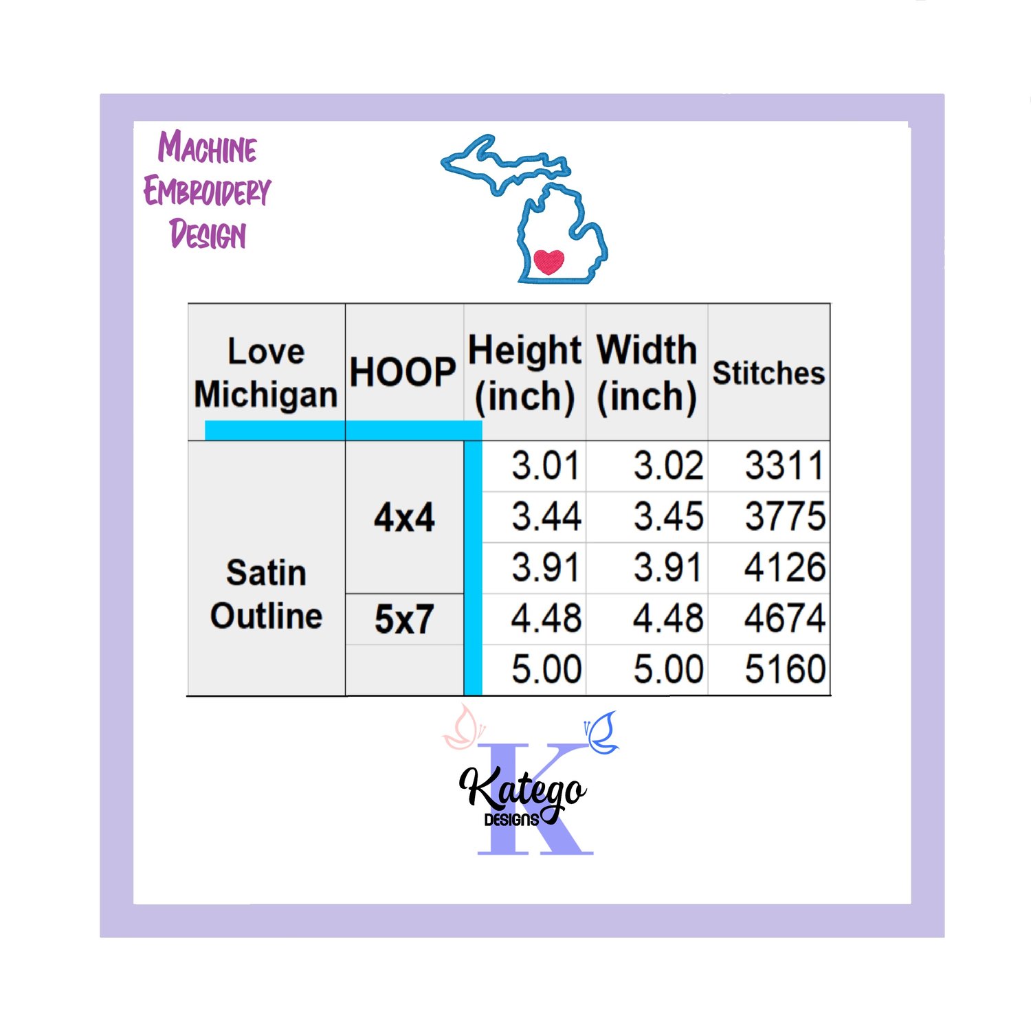 - Love Michigan Satin Outline: 4x4 and 5x7 Hoop different style.