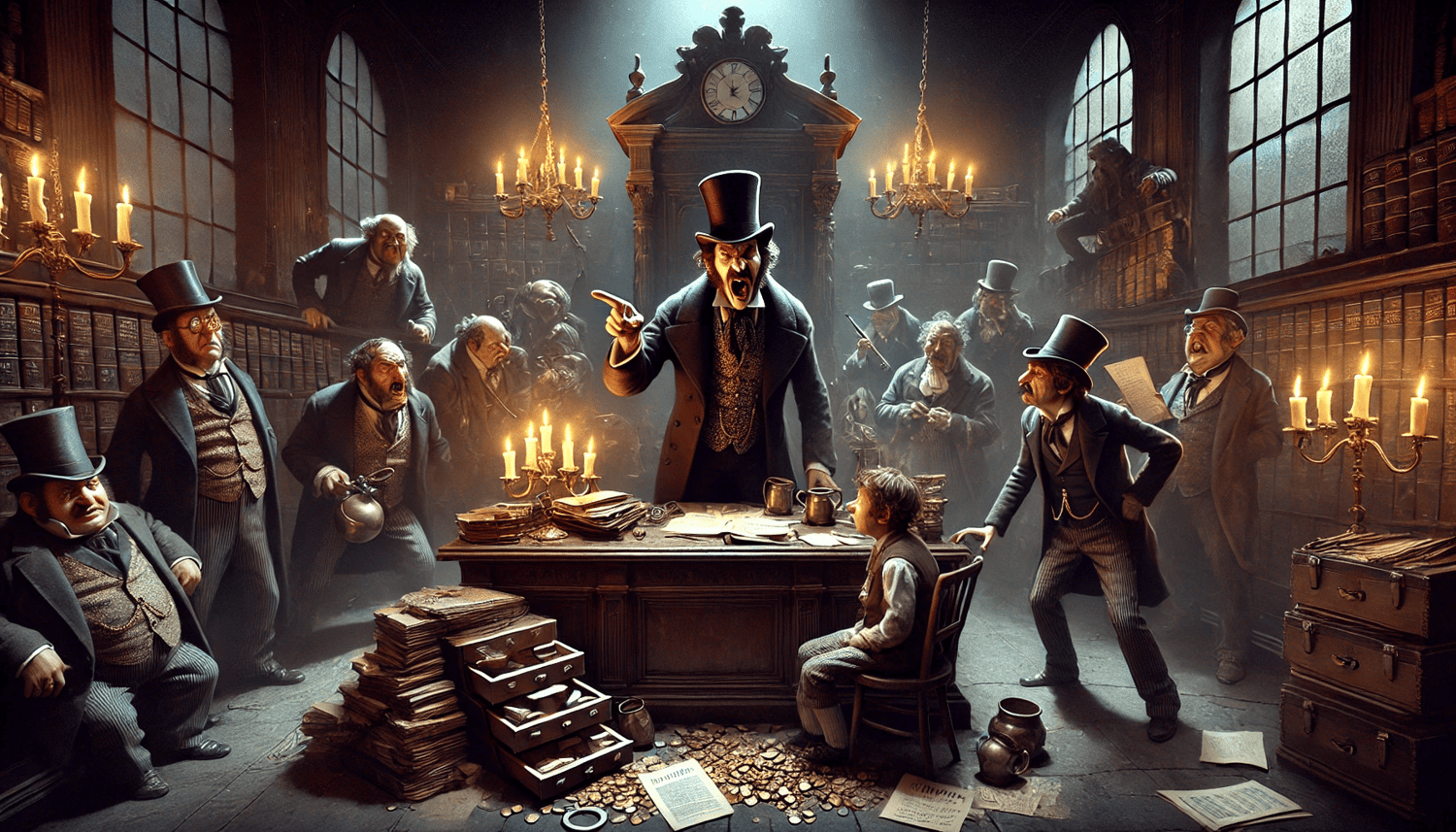 Step into the dark, candlelit world of Mr. Jaggers, the formidable lawyer from Great Expectations! His grand wooden desk is overflowing with towering stacks of legal documents, scattered coins, and ominous handcuffs. With a piercing glare, Jaggers aggressively points at a trembling client, while Pip stands anxiously nearby, clutching his hat. The room is alive with chaos—aristocrats, criminals, and desperate petitioners jostling for his attention in the dimly lit, smoke-filled air. A satirical tribute to the absurdity of Victorian law and power dynamics, this artwork blends gothic drama with dark humor.