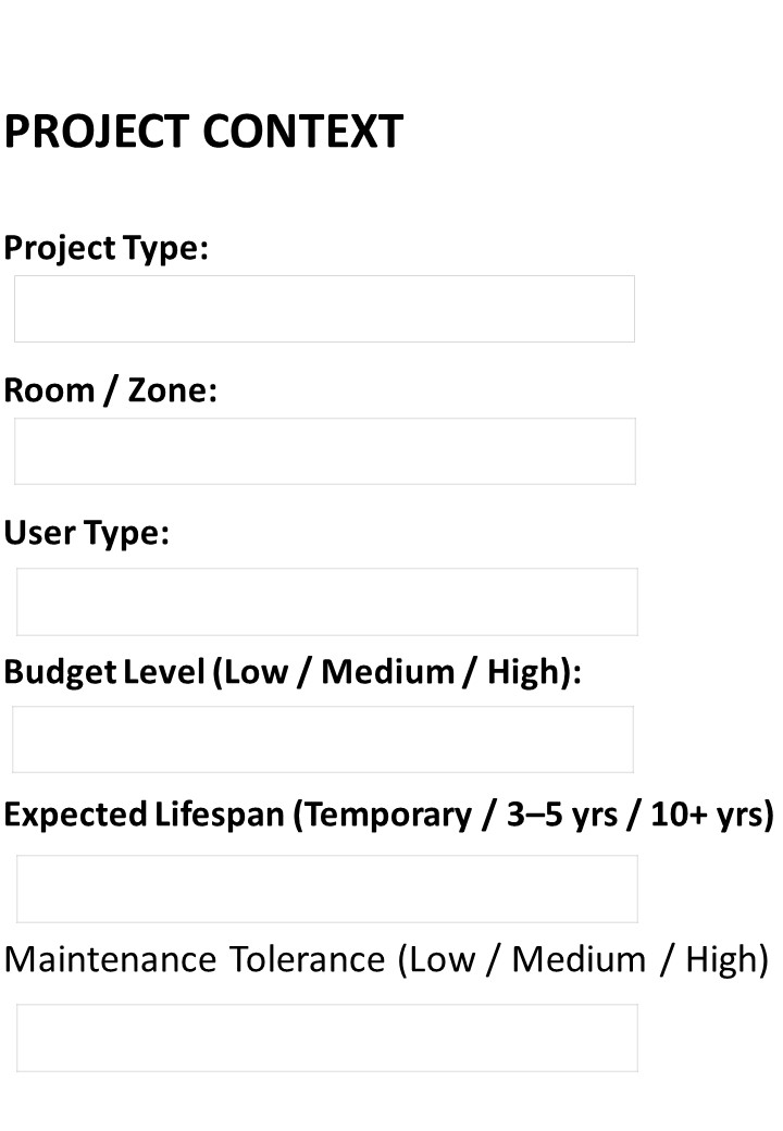 The Material Decision Worksheet is a practical, step-by-step tool designed for interior designers, architects, and design students who want to choose materials based on logic, function, and real project conditions — not guesswork.