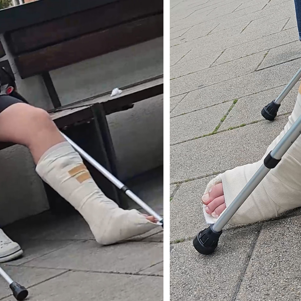 You can see him sitting on a bench and afterwards crutching a bit.