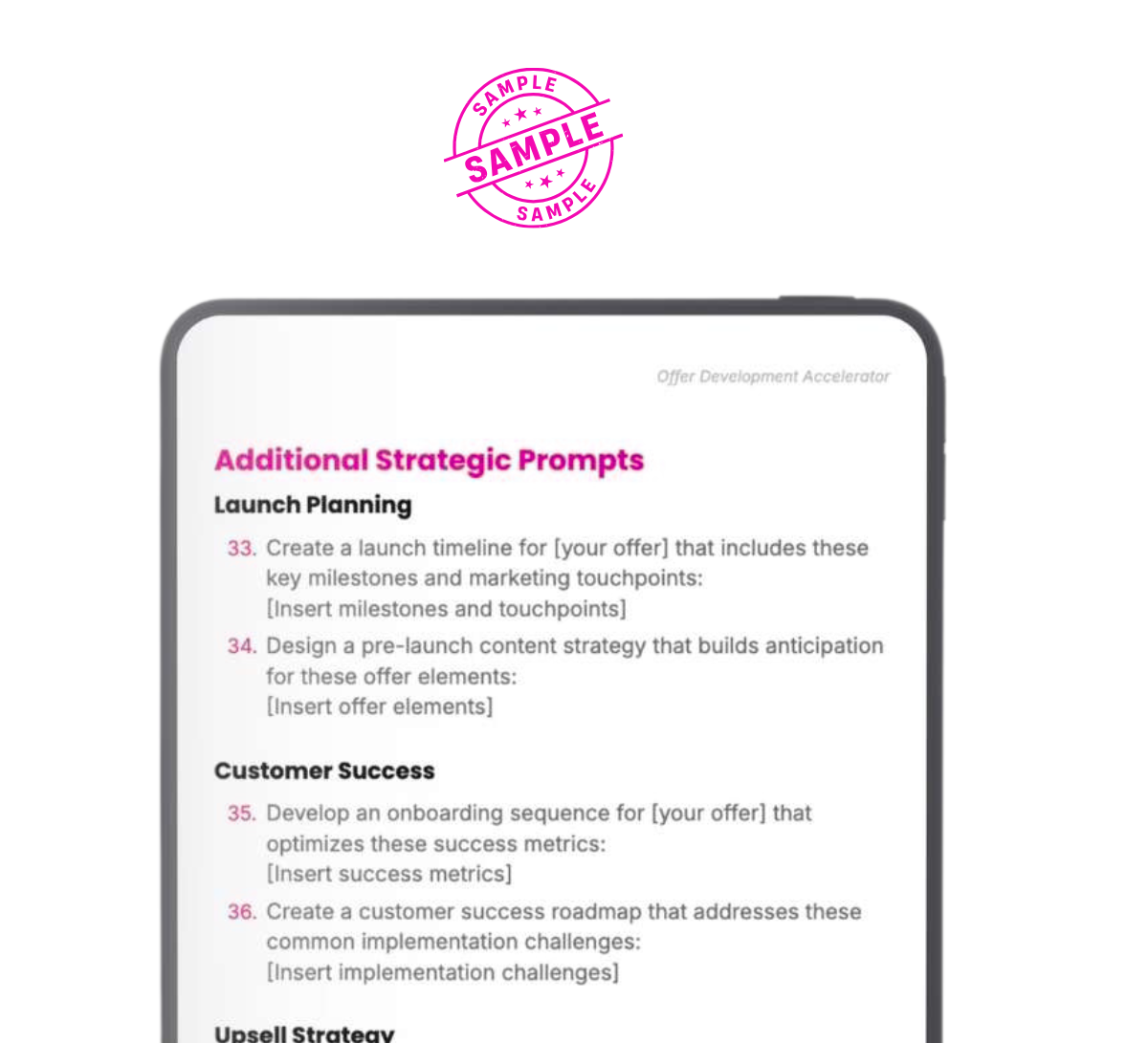 - Prompts for crafting strong sales copy, presentations, and customer onboarding plans.