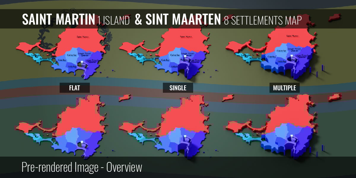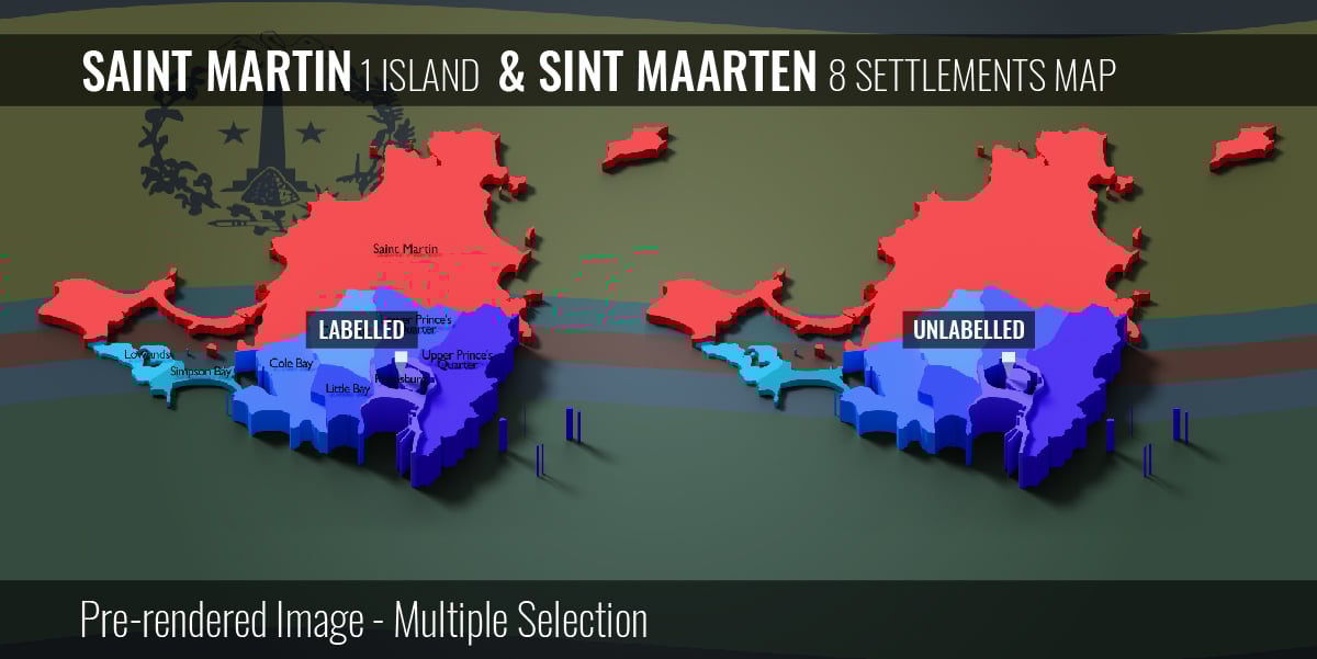 Saint Martin - 1 Island & Sint Maarten 8 Settlements Map (3D + Pre-rendered Images)