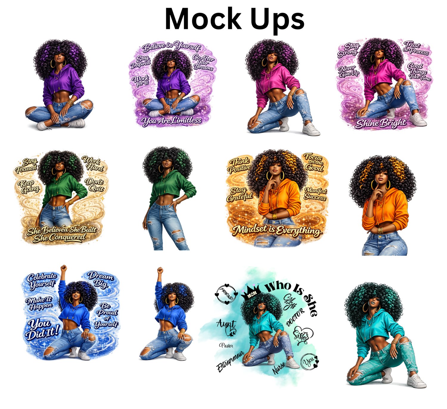 The Afro Curly Girls Editable Affirmation Design Bundle is a bold, empowering digital collection celebrating confidence, self-love, and melanin magic. Featuring stylish Afro-curly women in confident poses, vibrant colorways, and powerful affirmations, these high-resolution designs are fully editable and Canva-friendly.