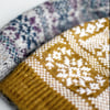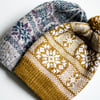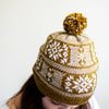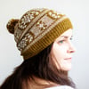 The Midnight hat is worked bottom up in the round. It features a large colorwork motif, which comes in two sizes. With the two different gauges given in the pattern, this results in a total of four sizes to choose from overall. The colorwork can be worked with only one contrast color for a bold motif, or with up to three contrast colors, to add a bit of a gradient effect to it. For a little extra something, you can also choose to add a pom-pom.
