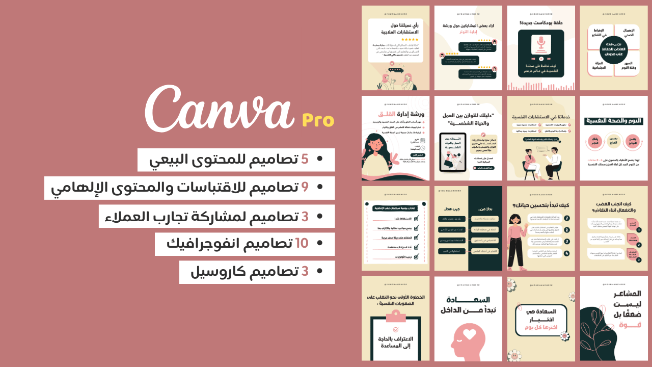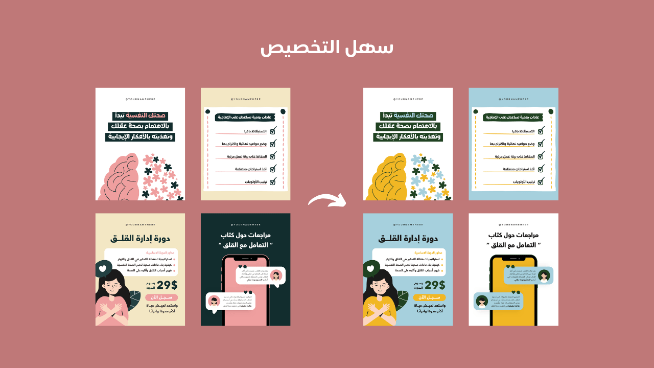 كل قالب جاهز للتعديل بسهولة على كانفا، بحيث تحفظ وقتك الثمين وتضمن أن يبقى تركيزك على تطوير عملك ورسالتك، بينما تتكفل التصاميم بجذب عملاءك وإبراز هويتك.