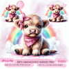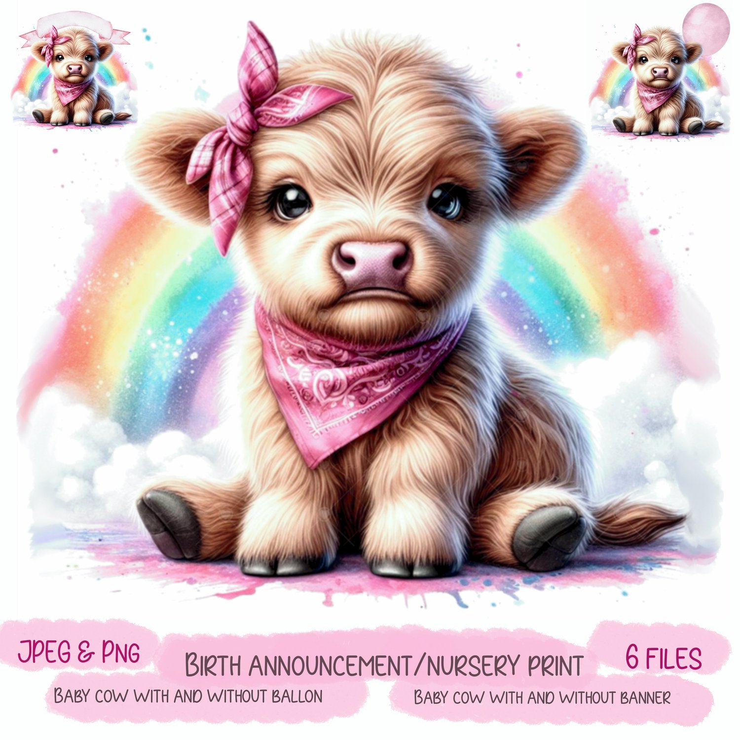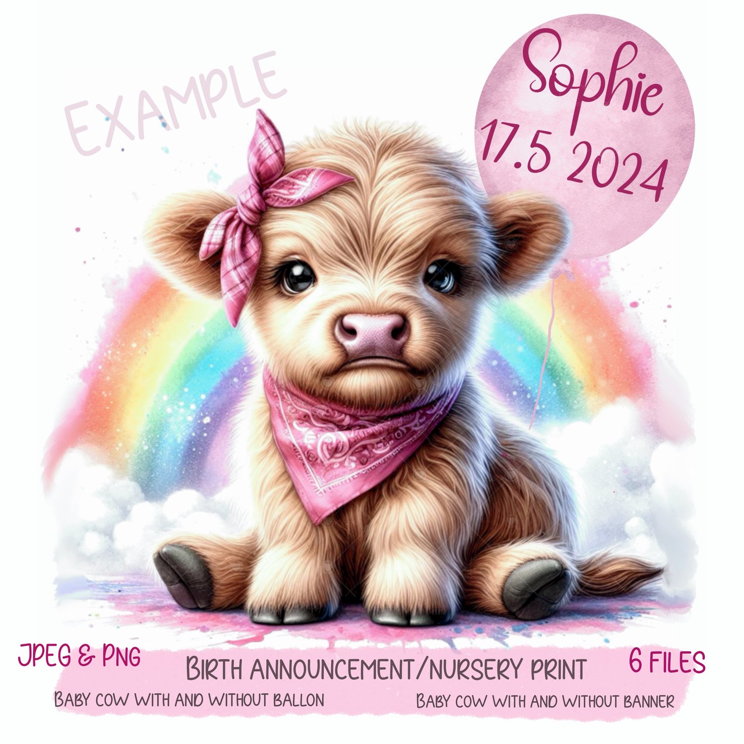 Beautiful newborn baby highland cow, birth announcement, nursery. 3 styles, balloon, banner, cow only. PNG & JPEG. Sublimation, print. Pink. Ideal for clothing, cups, prints, greetings cards, baby birth announcements, gender reveal etc. 6 files.