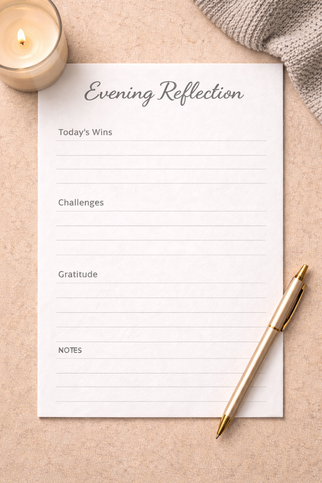 A clean evening reflection page designed for daily mindfulness and self-awareness. Use it to review your day, reflect on emotions, and create a calm closing ritual before rest.
