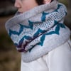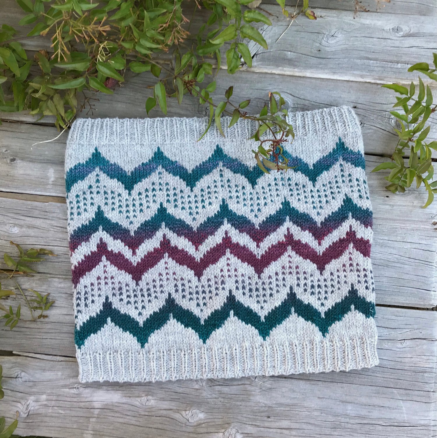 The Good Omen cowl is a fun way to indulge in some colourwork in the round while creating a cosy treat for your neck. Undulating wavy chevrons of softly transitioning colour make for an engaging knit with a beautiful result.