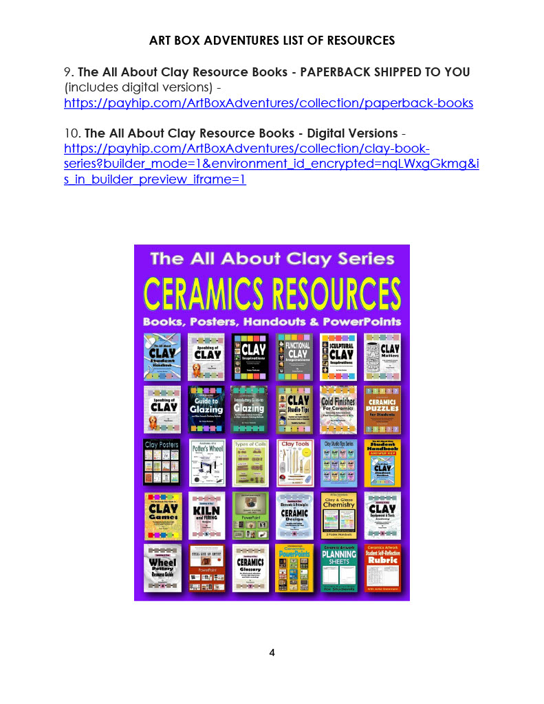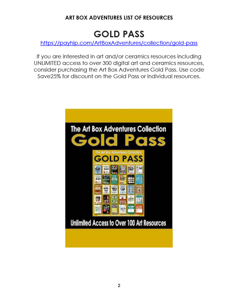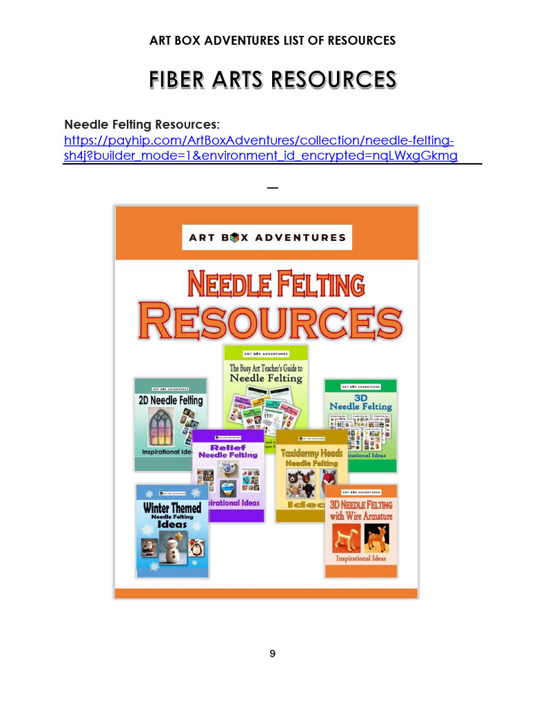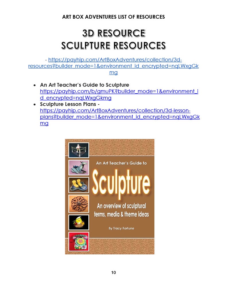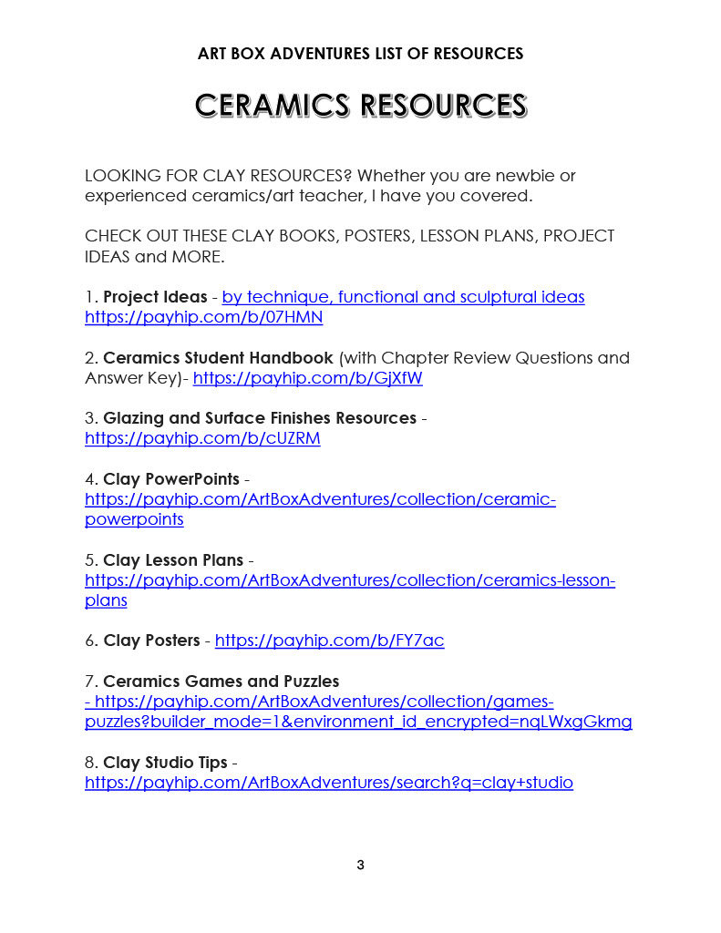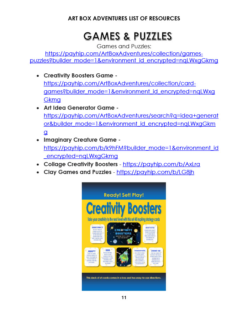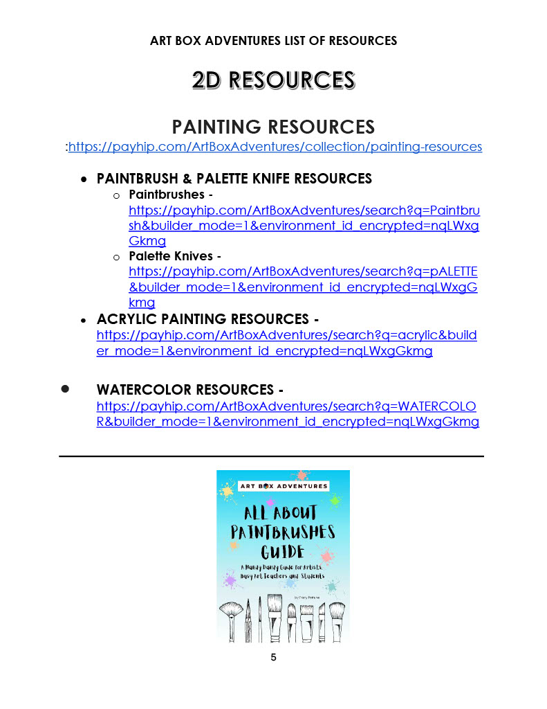 This resource provides an organized list of the resources available from the Art Box Adventures eStore. There are links to take you to where you can find each type of resource on the website.