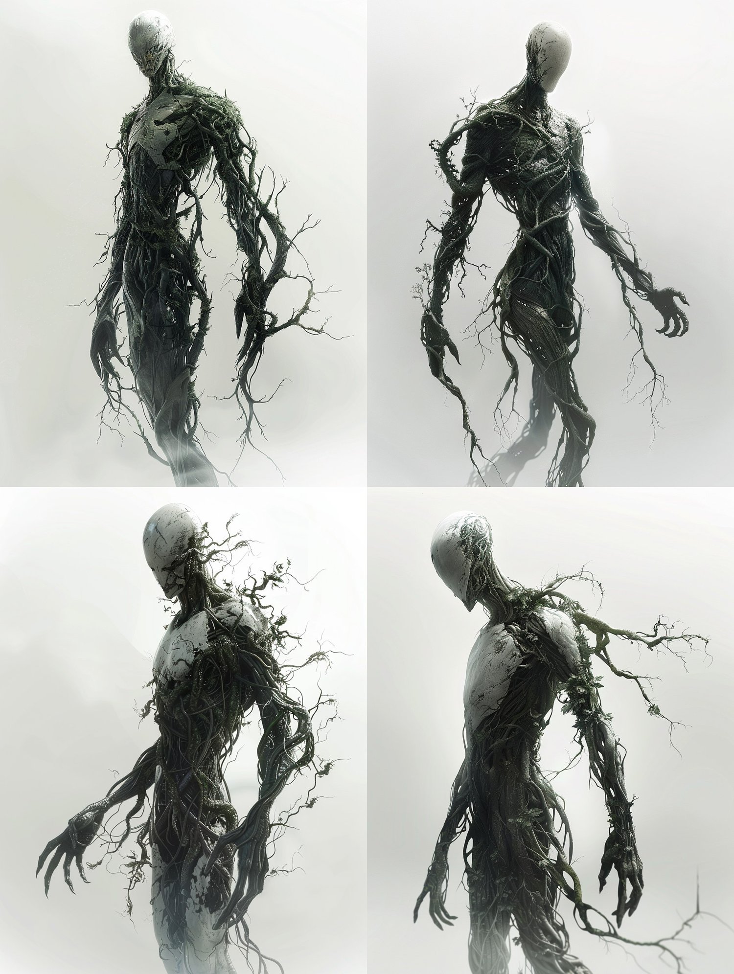 Design a striking Chinese symbiotic creature with this advanced AI prompt, ideal for cinematic concept art. Centered on a pure white background, it generates tall humanoid characters with bold architectural silhouettes and massive, solid forms. Weathered dark wood skin and gnarled branches emerge from shoulders and spine, paired with deconstructed voluminous robes in charcoal and forest green. Calm, wise Asian expressions combine with cinematic rim lighting and high contrast to emphasize three-dimensional form. Hyper-detailed textures and minimalist design produce clean, visually stunning characters ready for portfolios, films, or fantasy storytelling.