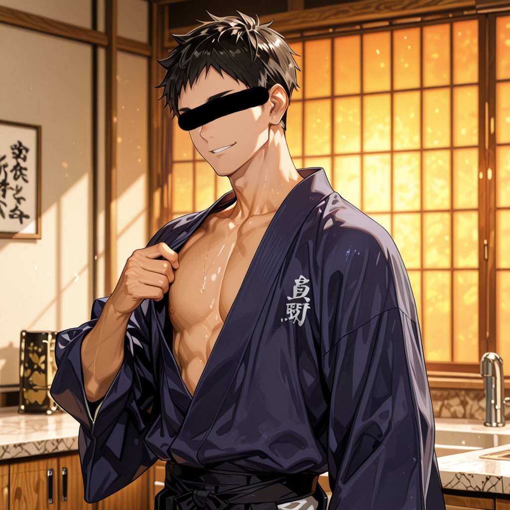 日本の正月をテーマに、着物を着用している男性を、キャラクターごとにお任せ作成しました。男らしいキャラクターの魅力を思い切って表現しました。