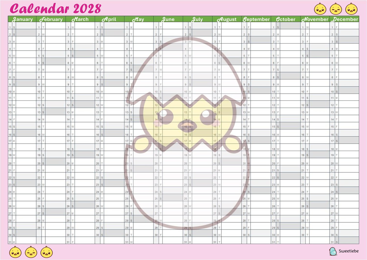 Quack your way through 2028 with this sweet duckling-themed calendar planner! Featuring a delightful little duck hatching from its egg, this single-page design is available as a versatile PDF file for digital use or printing. Whether you use it to organize your year on your devices or display it on your wall, this calendar will bring a smile to your face with its charming design. Perfect for duck enthusiasts, animal lovers, or as a thoughtful gift!