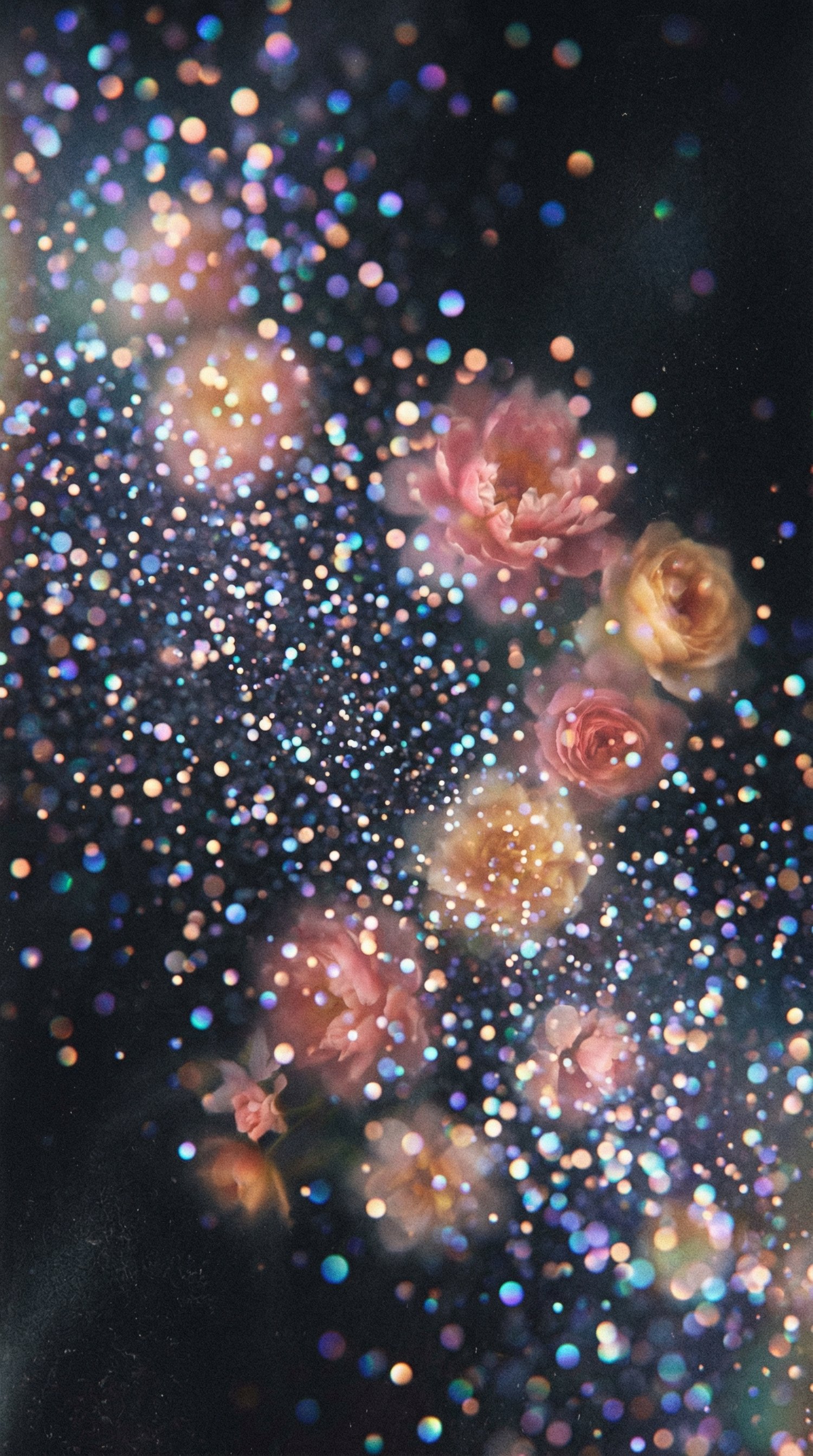 Step into a mesmerizing world where iridescent glitter dots float and shimmer against a deep black background, creating an elegant, dreamlike atmosphere. Subtle light reveals faint floral outlines amidst blurred, grainy textures, blending reality and illusion in a sophisticated composition. The interplay of warm and cool tones, dynamic blur, and delicate texture creates a soothing yet striking visual impact. Perfect for creators seeking minimalist, cinematic, and high-quality imagery that is both elegant and immersive.