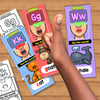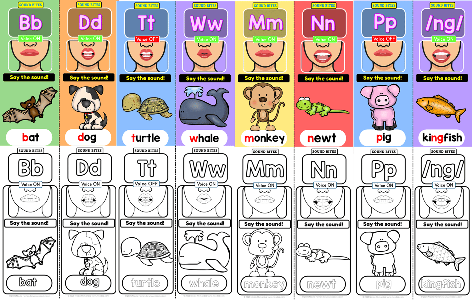 Each strip shows the sound, letter patterns, mouth position, voice on or off cue, and a clear animal mnemonic.