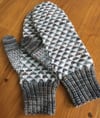 The multicolour sample was knit using Zwerger Yarn Opal 4-fach in colour 5191 Anthrazit as MC (dark grey) and various leftovers and as CC. Sample used about 146 meters (158 yards) of MC. Each row of CC triangles used about 5-10 meters (5-11 yards) of yarn. The lining was knit using leftovers. The lining per mitten takes about 20 grams of yarn (84 meters (92 yards)).