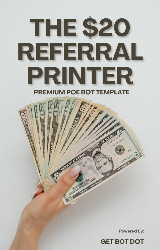 Get Bot Dot's "$20 Referral Printer" is a strategic, ready-to-use template designed to help you create Poe bots that ethically maximize Pro referrals while delivering genuine value to users. For each person who subscribes to Poe Pro through your bot's referral link, you earn a $20 commission.