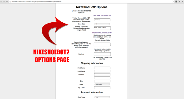 The NikeShoeBot2 works similar to the original NikeShoeBot, but adds in some additional functionality such as being able to purchase multiple shoes (not two of the same though) plus a speed boost to increase the success rate. This would be done by adding additional keywords to the options page before enabling the NikeShoeBot2. The NikeShoeBot2 is actually a browser plug-in (extension) that will only work with Google Chrome. It’s very simple to put to use. All a user must do is fill in the NikeShoeBot2′s option page with their billing information, select a size, enter a pre-determined keyword or two or three (which we’ll send to you for each release) and the NikeShoeBot2 does the rest. The only thing you’ll have to do AFTER the bot is running is VERIFY your a human by follow Nike.com’s Quick Verification process.