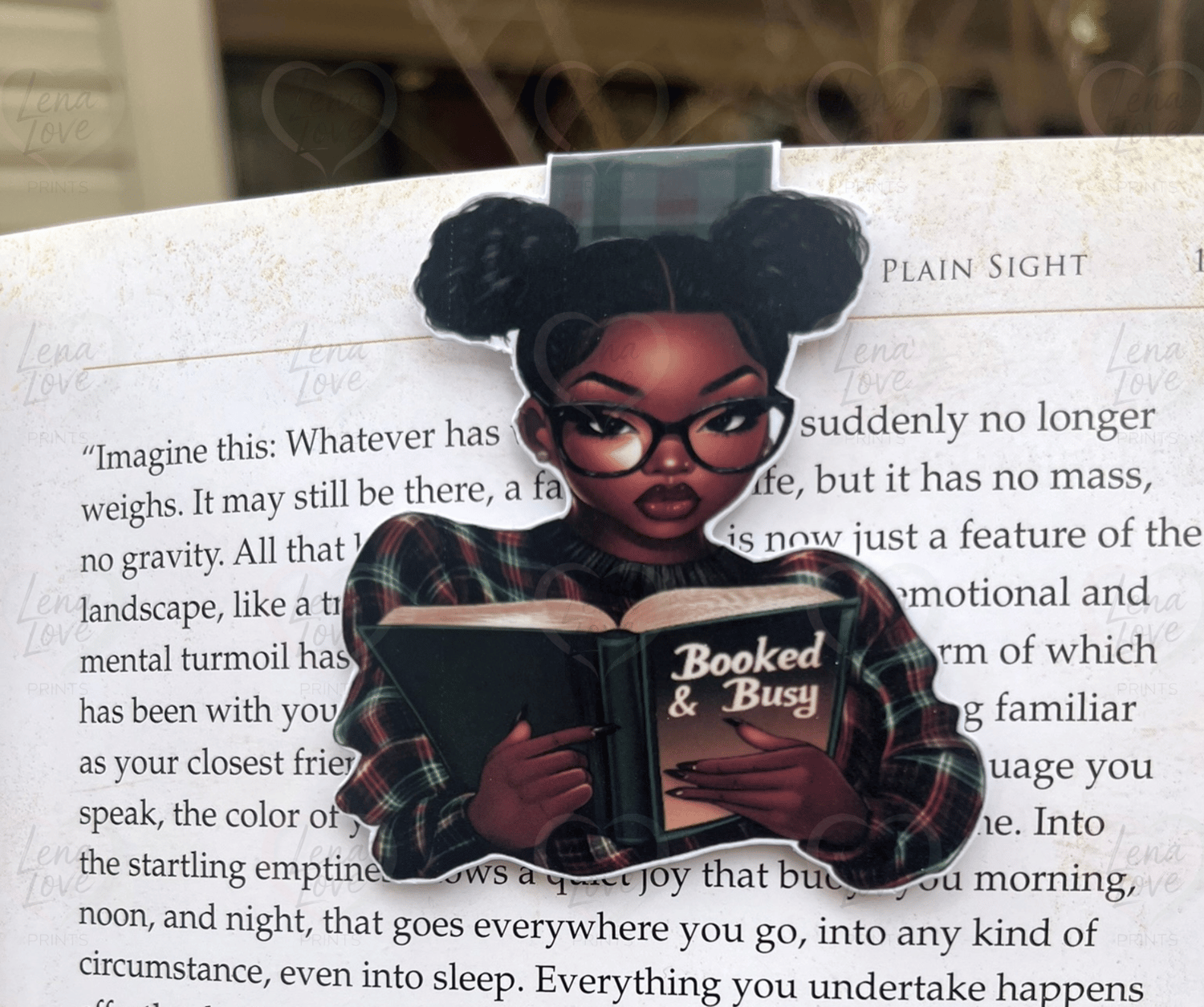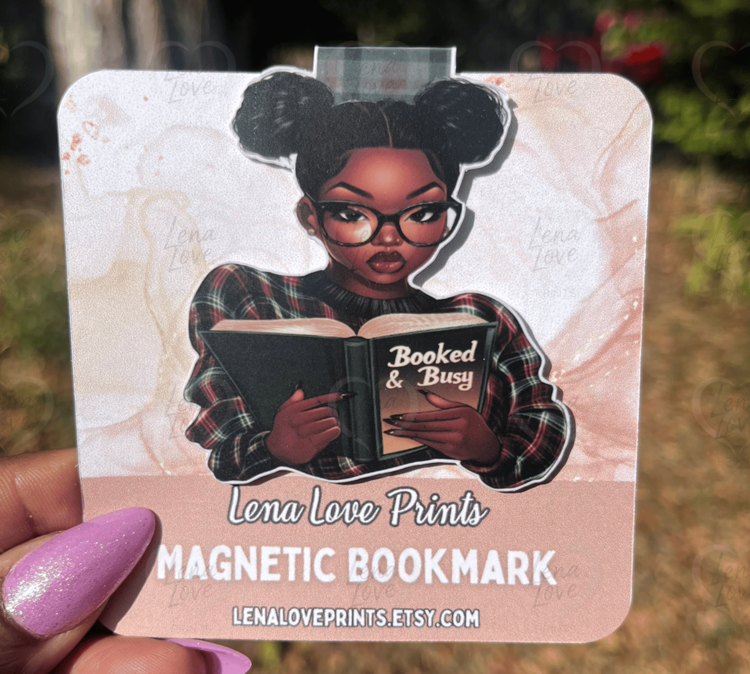 This “Booked & Busy” magnetic bookmark celebrates the beauty and power of Black women with natural hair. Featuring a bold, stylish illustration of a girl reading, it’s a perfect mix of confidence, culture, and bookworm energy. Made from durable cardstock with strong magnets, it keeps your page secure without slipping or damaging your book.