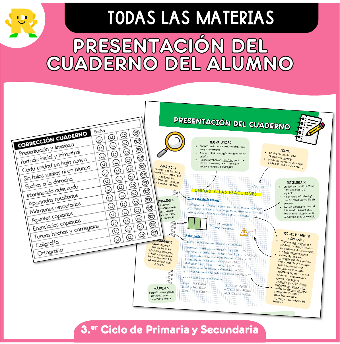 Hoy os traigo un material muy especial para que vuestros alumnos puedan llevar un cuaderno bien organizado y sepan cómo presentar su trabajo de manera clara y efectiva. Además, incluyo unas hojas de rúbricas recortables que os servirán para evaluar los cuadernos del alumnado o para que ellos mismos puedan autoevaluarse. ¡Todo esto de forma gratuita!
