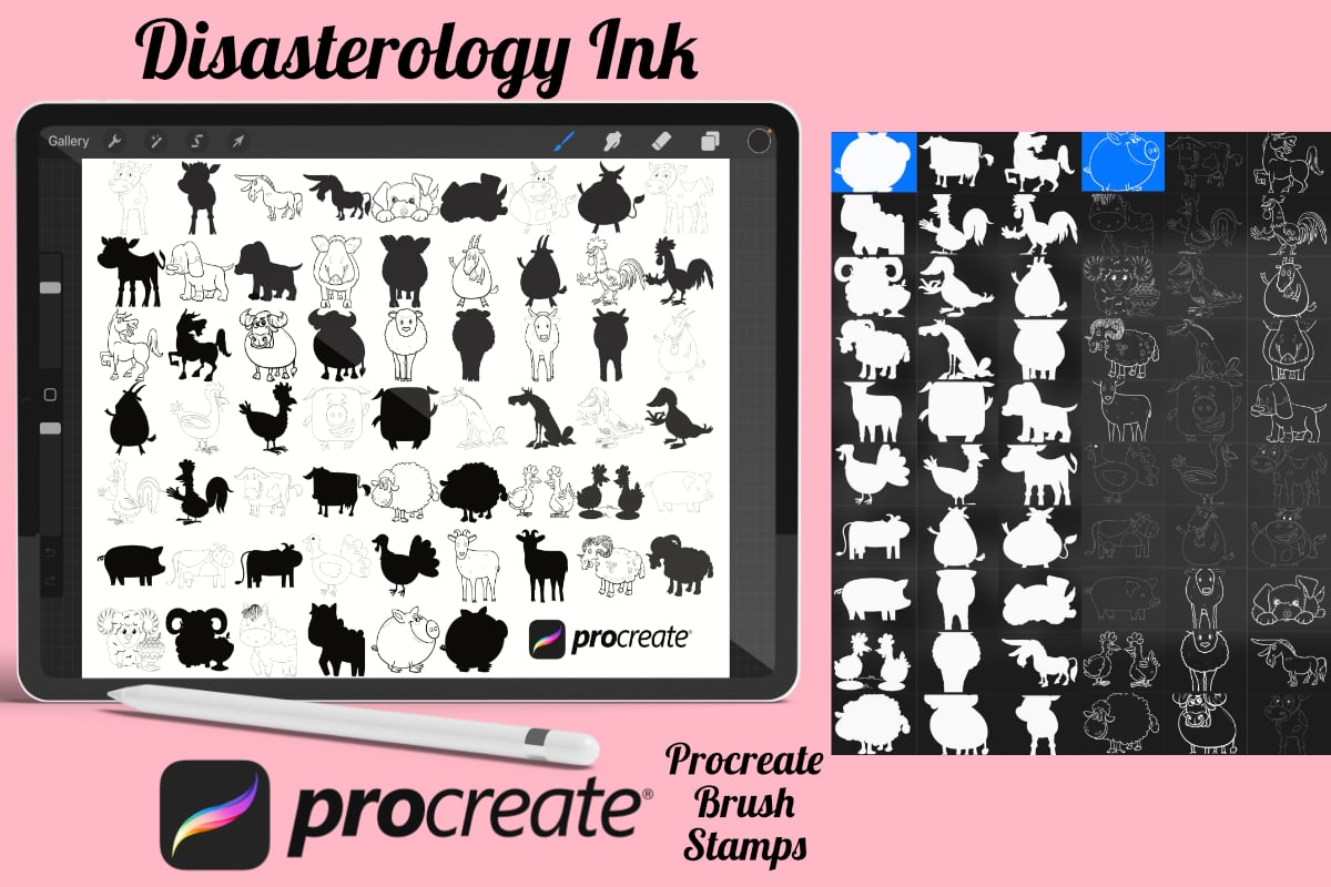 Pack of 60 Cartoon Farm Animals Procreate Stamp Brushes! These cartoon animal stamps are perfect for making illustration projects or any procreate purpose. You can use these in any colour or opacity and they can be resized to best fit your art. You need Procreate 5.0.8 or 5X, an iPad, and an Apple Pencil. Also, these stamp brushes are not pressure sensitive and can be used with third party stylus, Apple Pencil or even your finger. You can change the colour, size and opacity of these stamps.