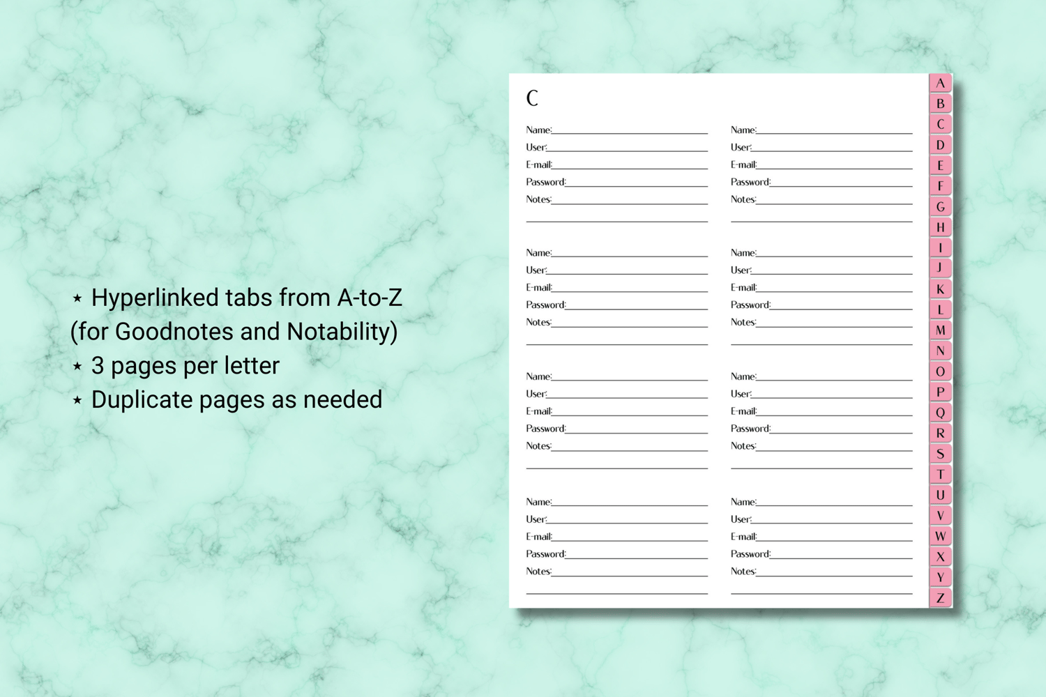 Never forget a password again with our Digital Password Book, a versatile hyperlinked PDF designed specifically for Goodnotes or any other note taking app. With its sleek design and a user-friendly interface, this password book is the perfect solution for organizing and safeguarding your online credentials. Choose the mode that suits your preference, whether you prefer a crisp, clean interface with light mode or a sleek, eye-friendly experience with dark mode.
