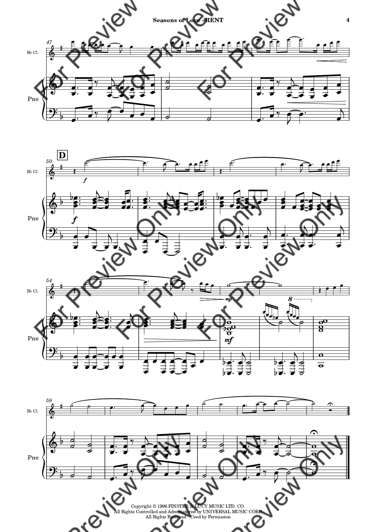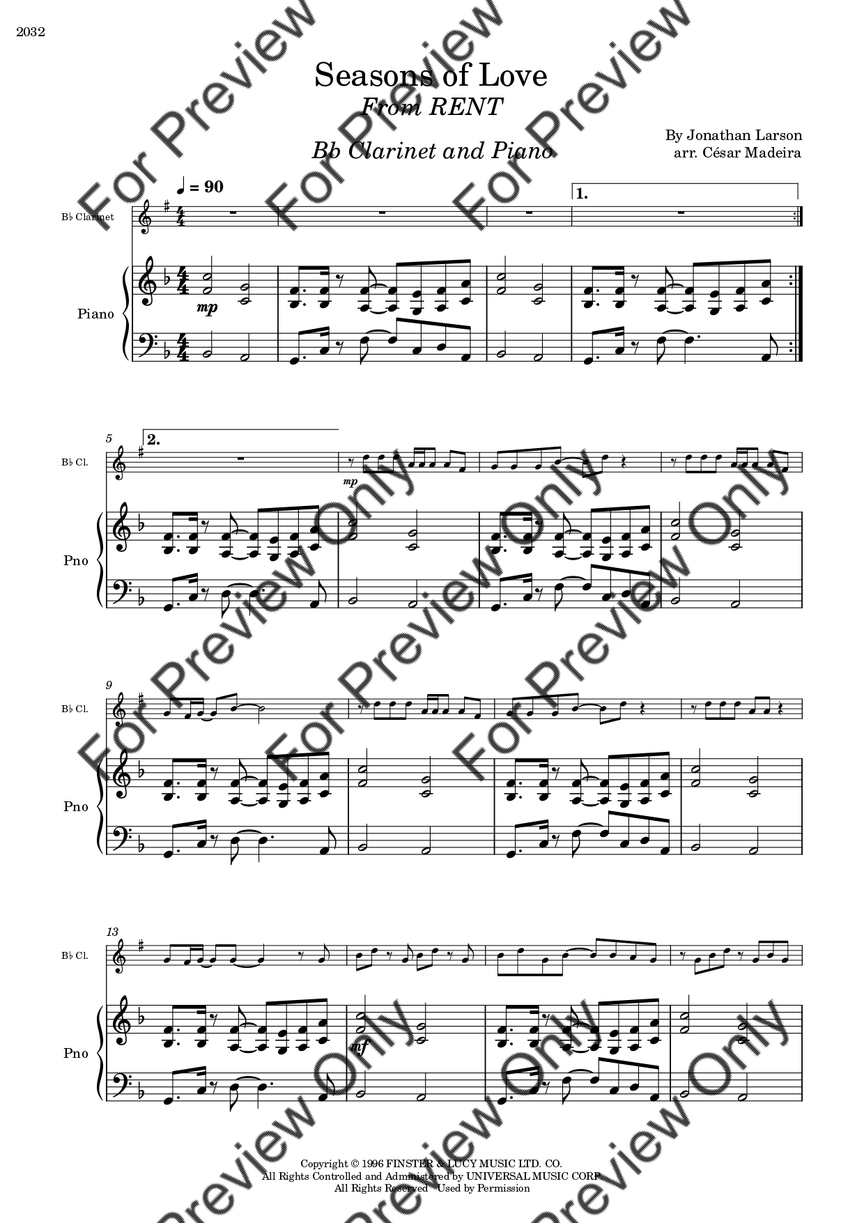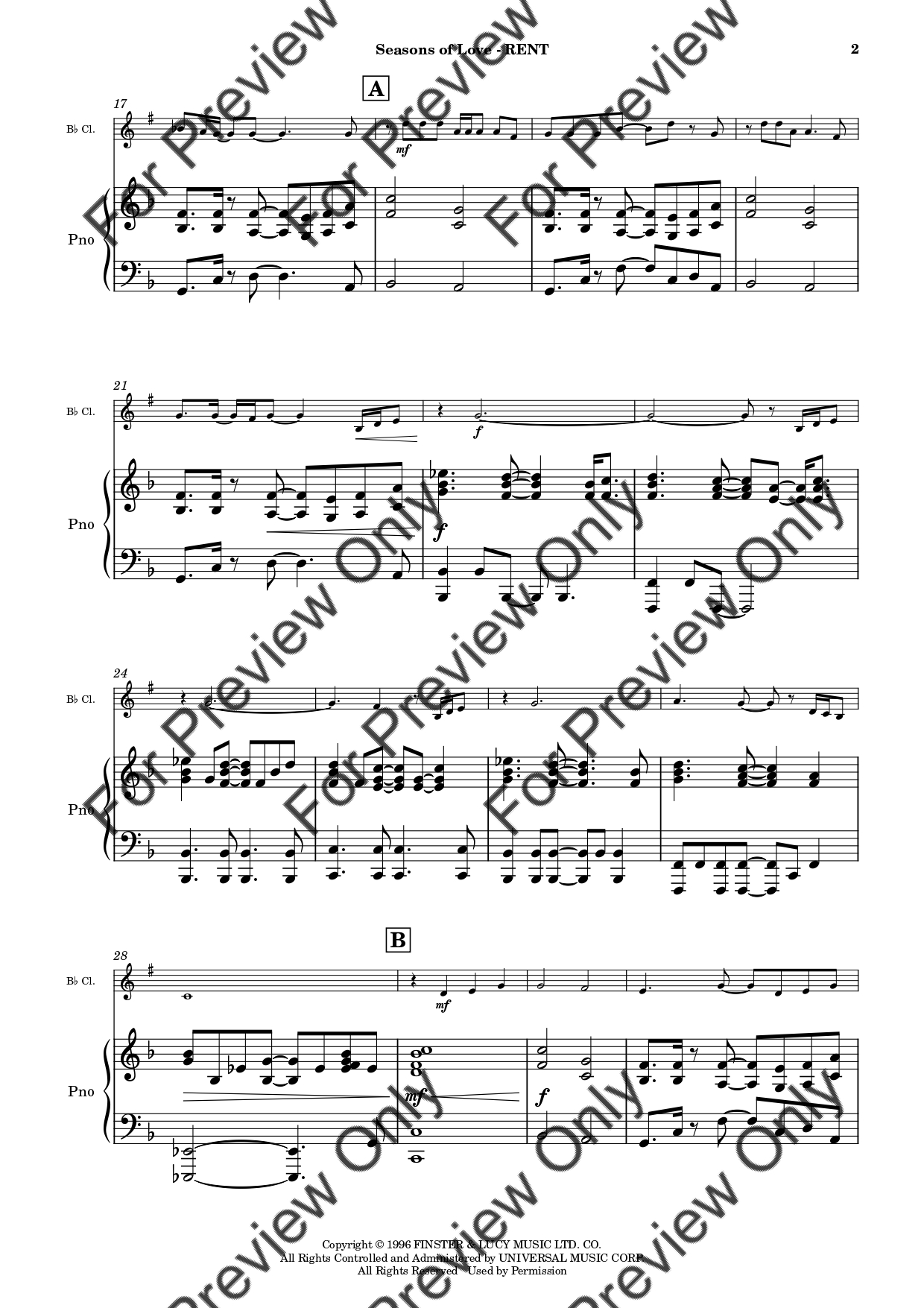 Seasons Of Love from RENT by Jonathan Larson. Arrangement for Bb Clarinet and Piano. With Full Score and Individual Parts. Have fun!