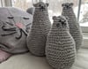 In 3 hours you can knit one of these giant huggable cats. The PDF file provides knitting directions on how to knit them. The finished size of the toy are 10" or 15" depending on the size you make.