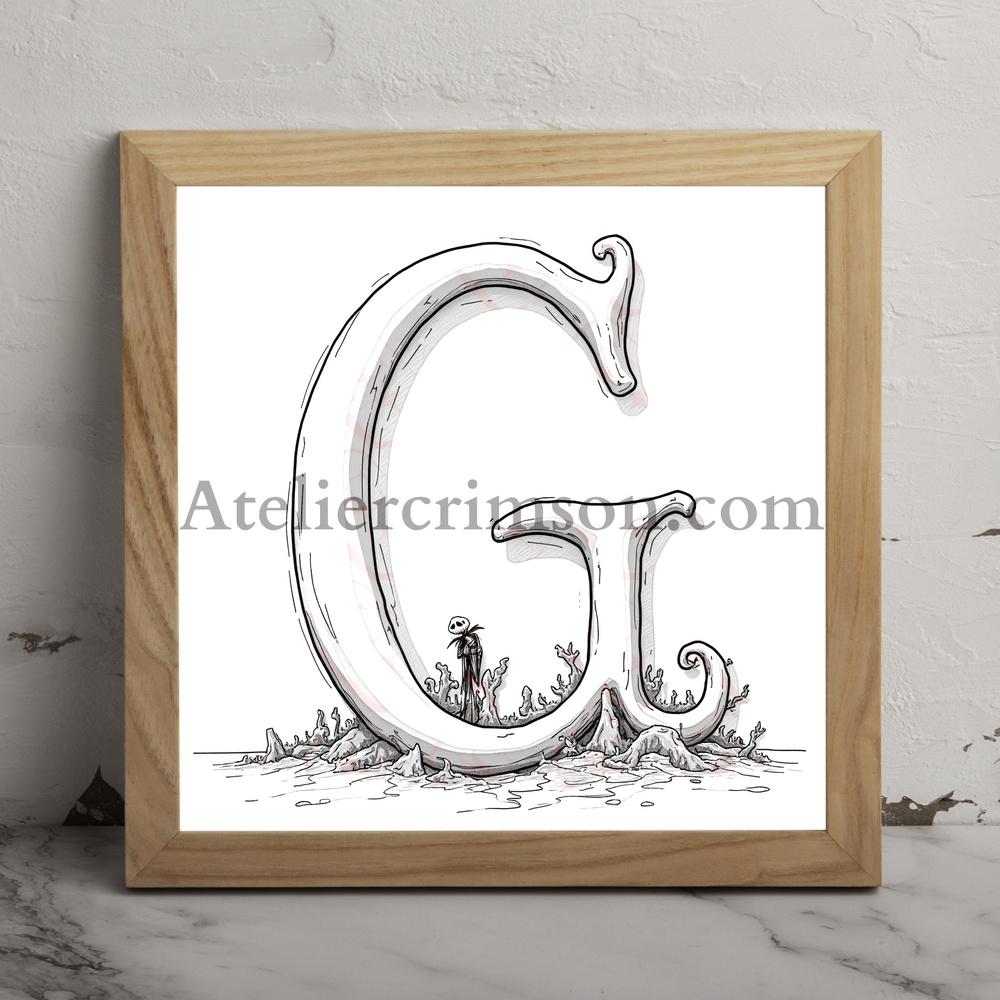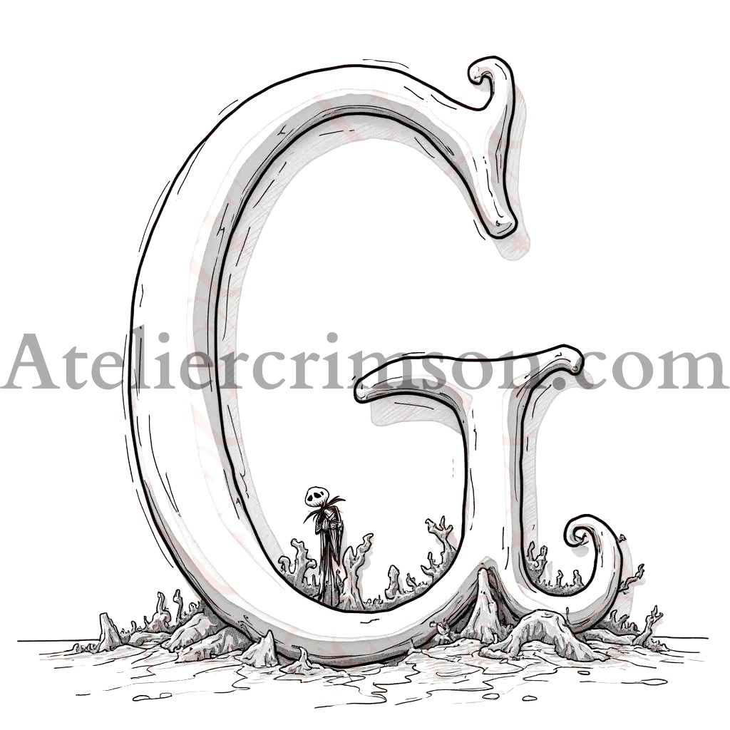 The letter G colloring book jack halloween Tim Burton-inspired alphabet art. Spooky-cute character in coloring book style. Perfect for Halloween crafts or gothic decor.
