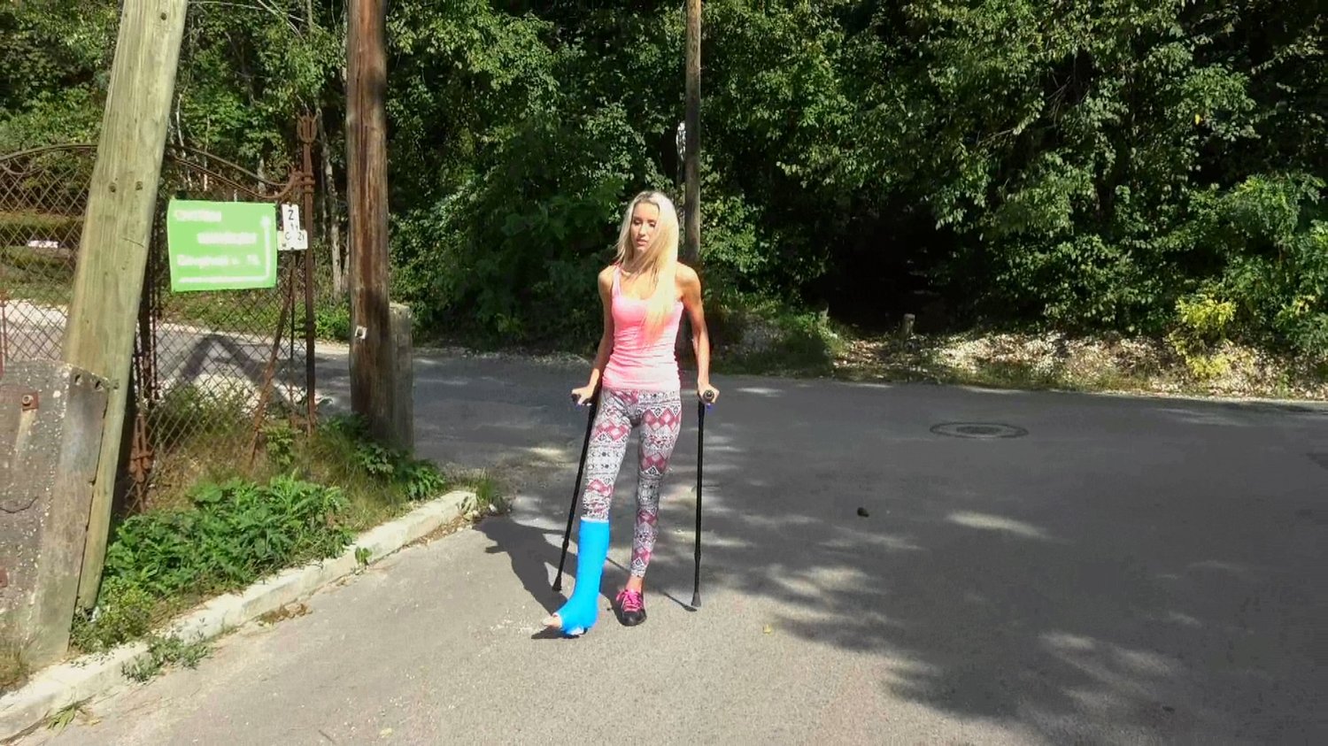 Sexy Britney is out walking on the street a late summer day in Budapest. She has a blue SLWC on her right leg and try to walk as much as she can on her broken ankle but some time the pain get to much for her so she start crutching.