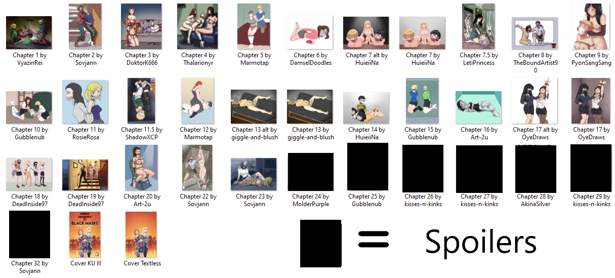 This is a work of fiction. The actions depicted — some of which contain non-consensual bondage, among others — are not condoned by the author, nor by any of the artists, nor by anyone else involved in the publication of this story.