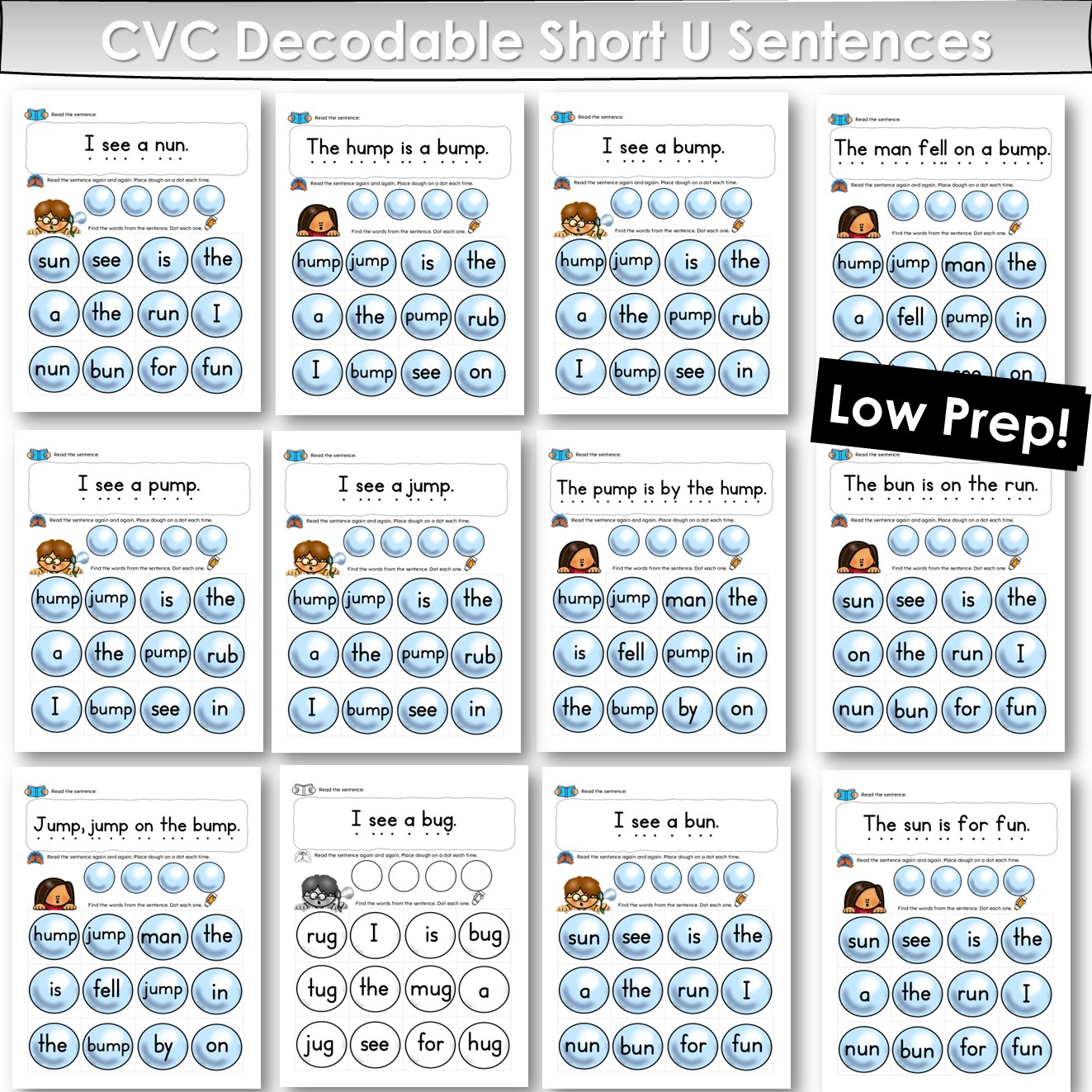 - 50 decodable sentence worksheets (Short U focus)