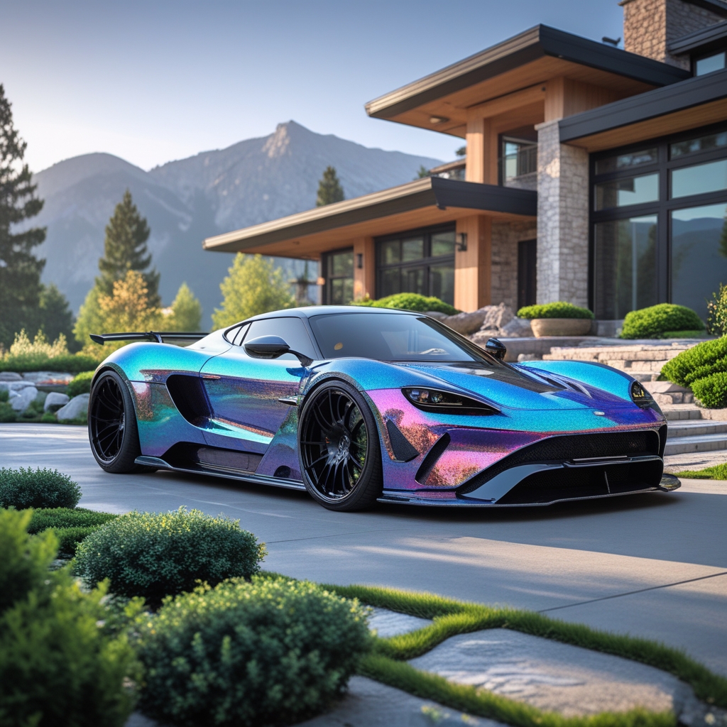A stunning Chromaflair NILU hypercar, fully customized with a Brabus body kit, featuring sleek matte black mags wheels, parked in the driveway of a luxurious modern mountain house. The scene includes beautifully landscaped gardens with vibrant greenery, decorative shrubs, and elegant stone pathways. The car’s color shifts dynamically with the light, showing iridescent Chromaflair reflections. The modern mountain house has large glass windows, natural wood and stone accents, and a panoramic view of the surrounding mountains. Soft sunlight enhances the textures of the car and the garden, creating a high-end, cinematic, and ultra-realistic atmosphere.”