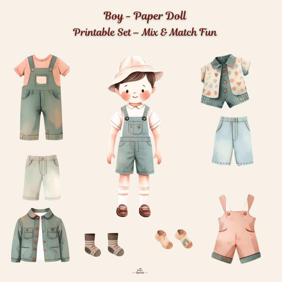 This printable set includes a charming paper doll boy with mix-and-match outfits and a dedicated vocabulary page — perfect for combining imaginative play with language learning.