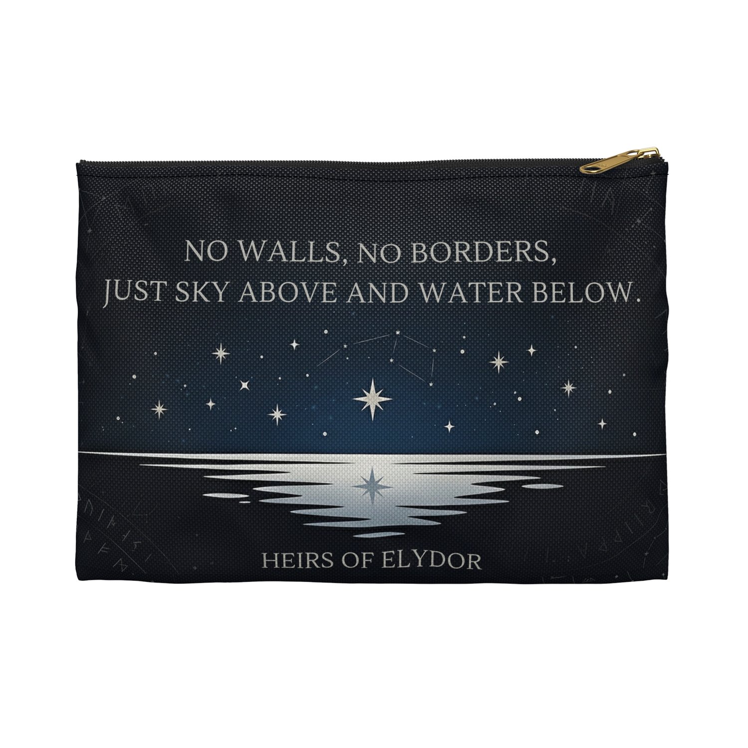 Pulled directly from the pages of the Heirs of Elydor series, this quote lives on a slim, two-sided zip pouch built to travel with you. Deep navy, soft silver and a star-reflected horizon looks like something conjured from the world itself. Maybe by Terran?