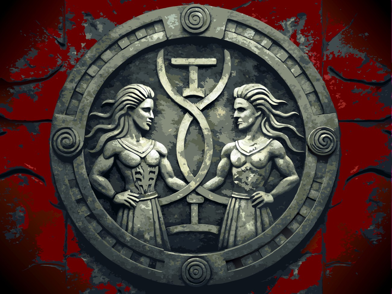 - Depicts the Gemini zodiac symbol with intertwined twins