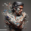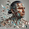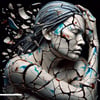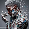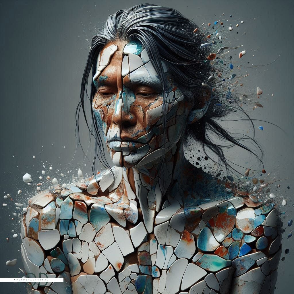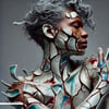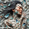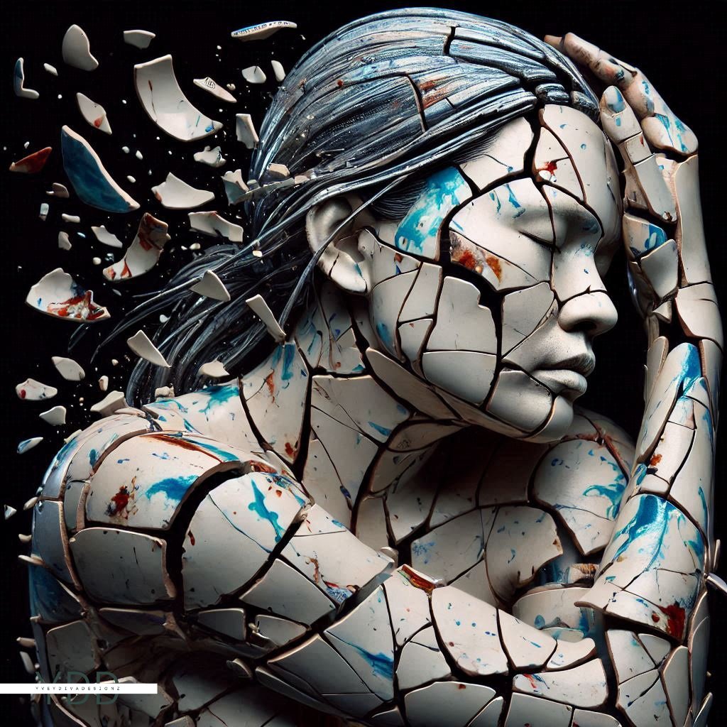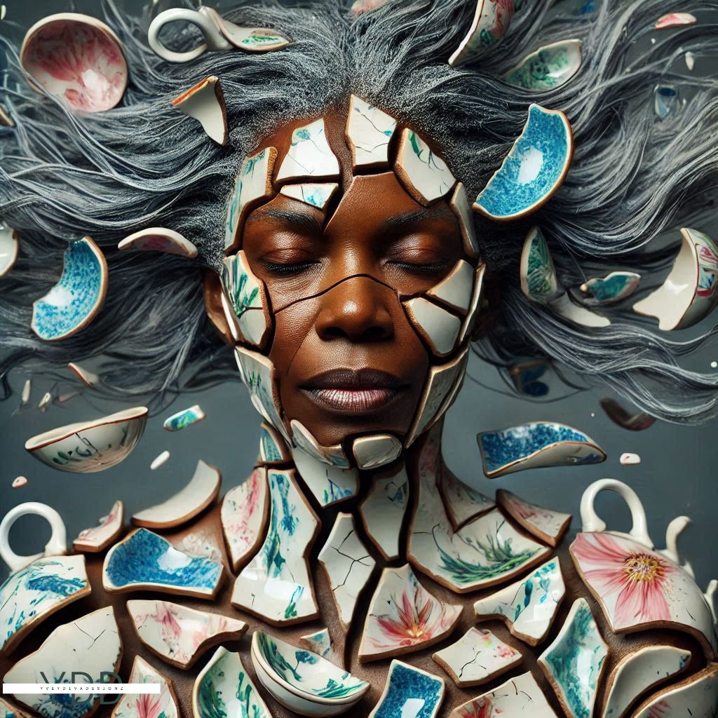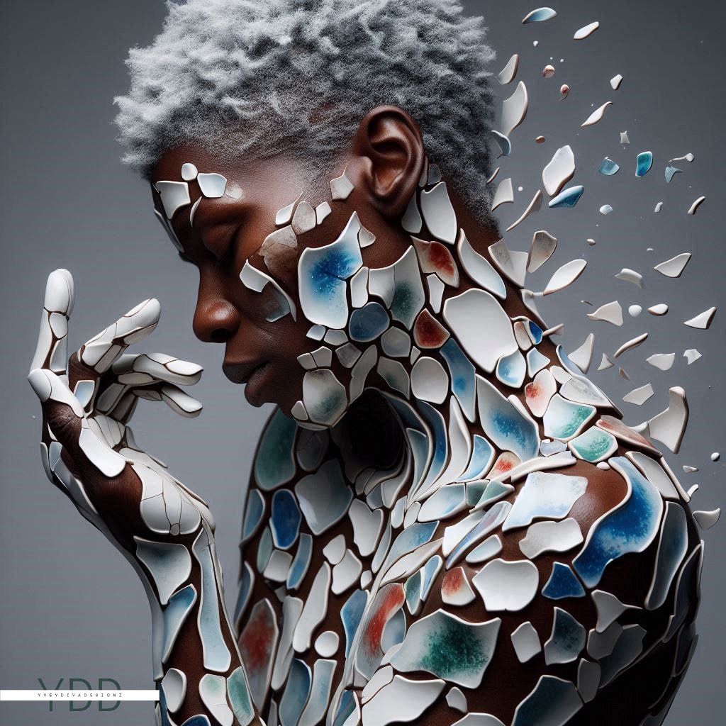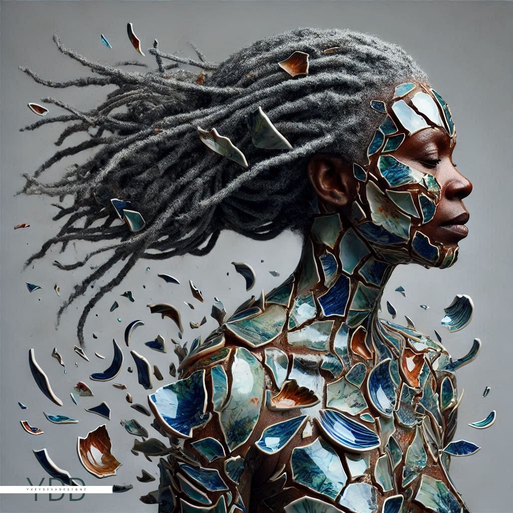 A mesmerizing portrayal of resilience and beauty, this artwork captures a middle-aged Caribbean woman, her dark hair and body streaked with silver, fractured yet gracefully entwined within a sea of shattered porcelain. The glistening shards, splattered with glossy and matte blues, greens, oranges, and reds, dance between motion and stillness. Her luminous, porcelain-like skin radiates an ethereal essence, transforming fragility into strength and chaos into art.