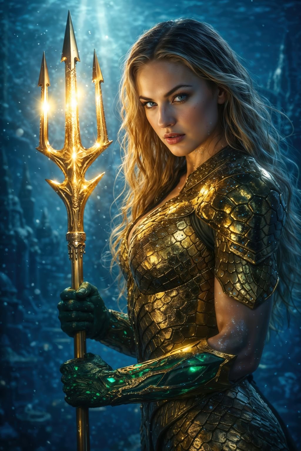 This premium 10K artwork captures Aquawoman at her most commanding—an ocean-born guardian forged in gold-scaled armor, trident blazing like a lighthouse in a storm. Every detail is built to reward close viewing: shimmering textures, cinematic lighting, and that unmistakable stare that says the sea answers to me.