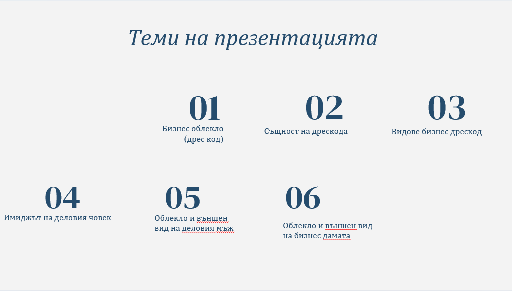 Презентация на тема: "Външен вид на деловия мъж и деловата жена" - Презентация по предмета Бизнес комуникации в IX клас. *Съдържанието на презентацията можете да видите на втората снимка. Презентацията е създадена от ученик обучаващ се в спец. икономическа информатика, изкарал отлична оценка /6.00/ от презентацията. Съдържа 23 слайда. Обхваща 7 теми, като последната е обобщение.