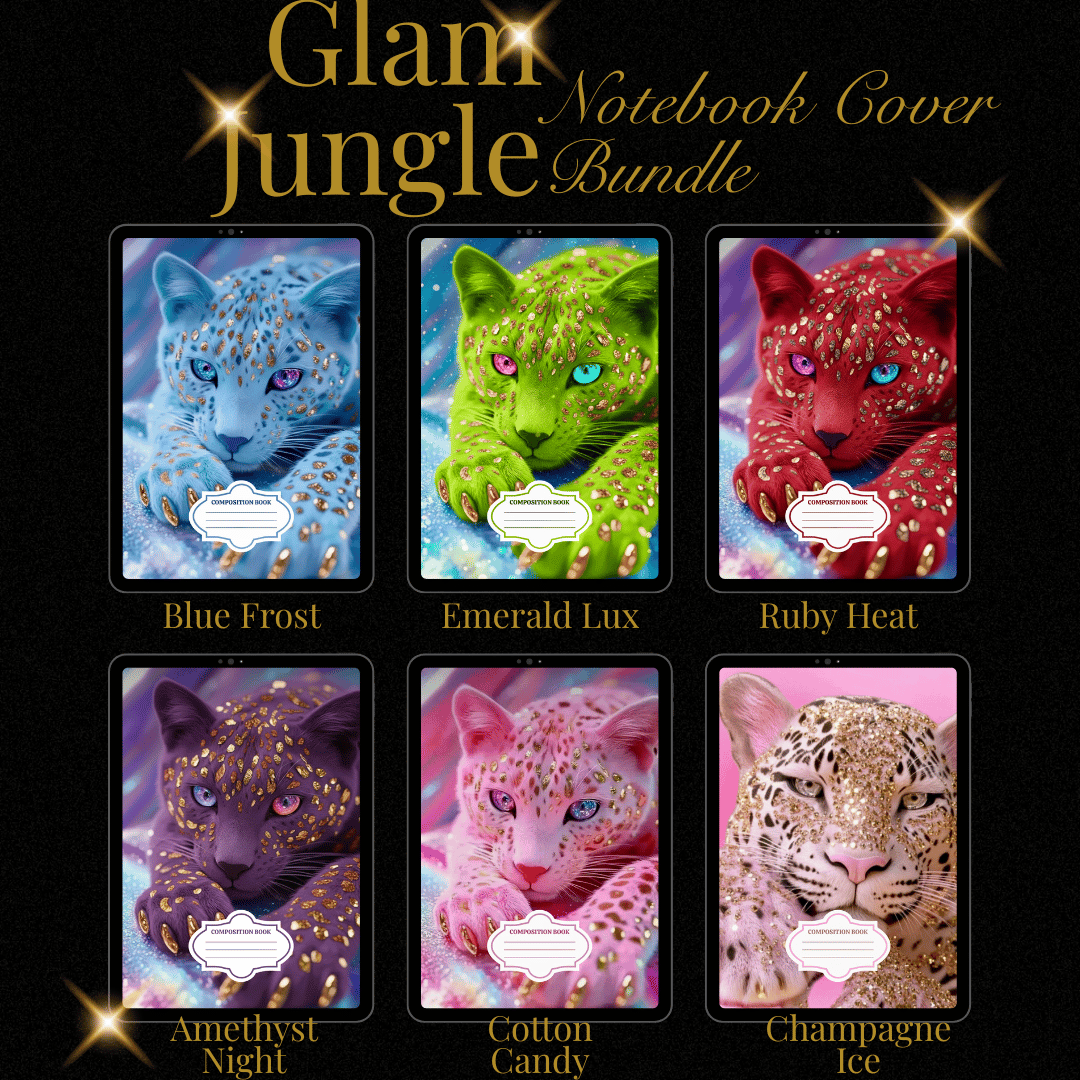 Bring bold beauty to your digital or printable journals with our Glam Jungle notebook cover bundle. Each cover showcases a luxurious leopard in radiant colors—from icy blues to sizzling reds—adorned with gemstone-like details and cosmic sparkle backdrops.