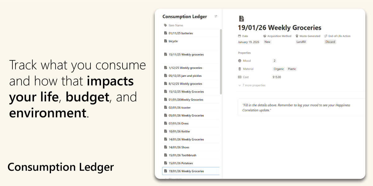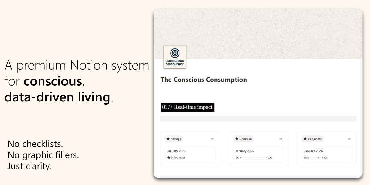 The Conscious Consumption Tracker is a premium Notion system designed for people who want to live intentionally, not perform sustainability. Instead of ticking boxes, you build a clear, honest picture of how you consume, reuse, repair, discard, and invest your resources over time.